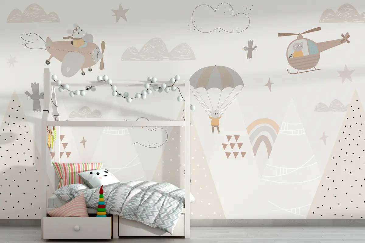 Stenske poslikave Bež gore s helikopterjem, letalom in živalmi Št. w00414