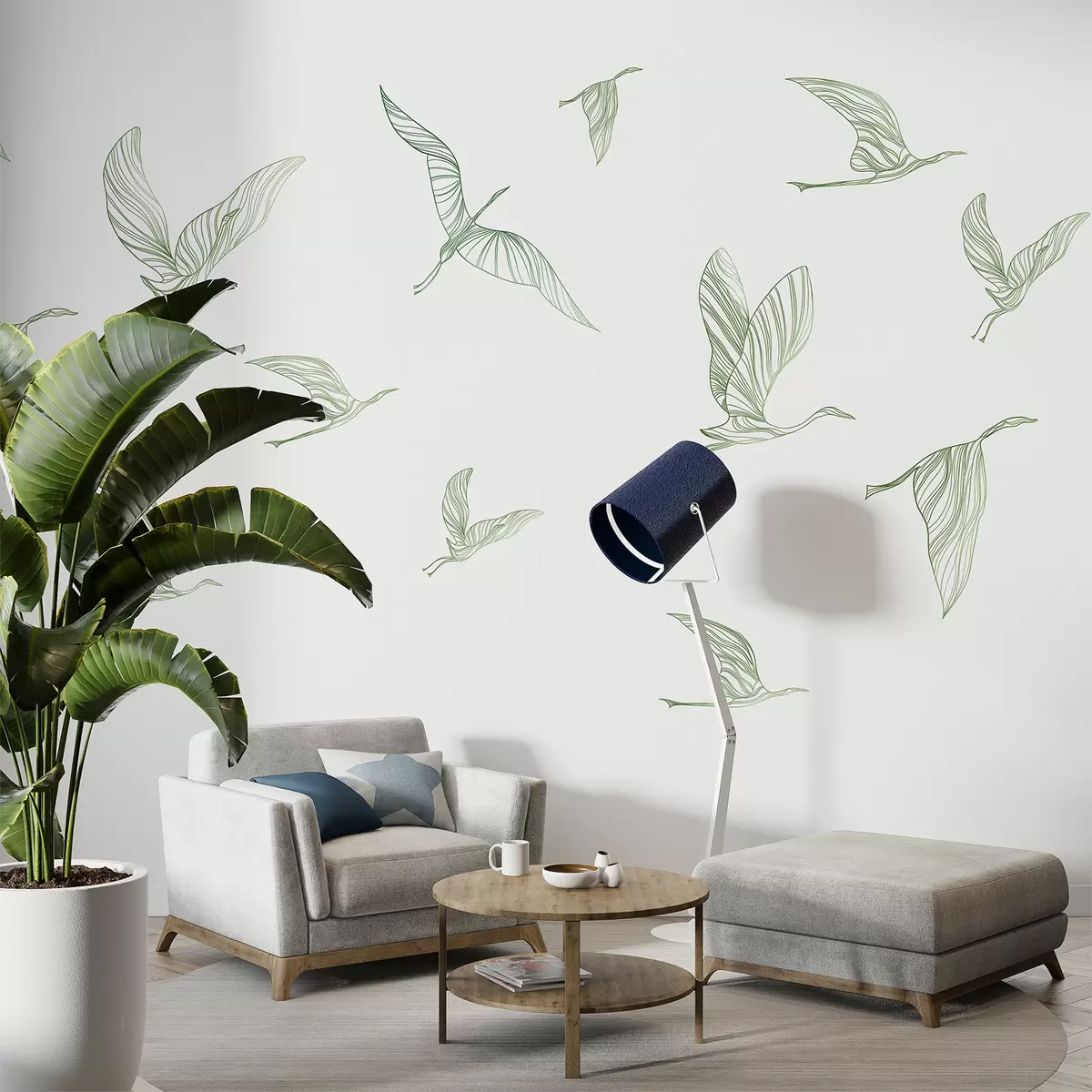 Stenske poslikave Linija letečih ptic, minimalizem, narava, zelene barve Št. w00758v2