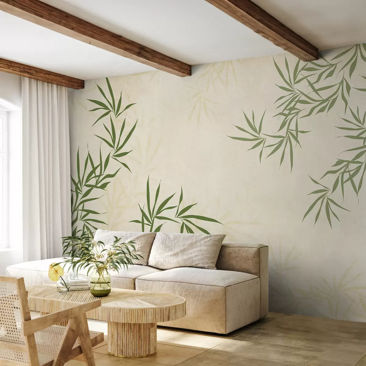 Stenske poslikave Rastlinske vejice, bambus, vintage stil, tekstura ozadja, rumena, zelena barva Št. w00817