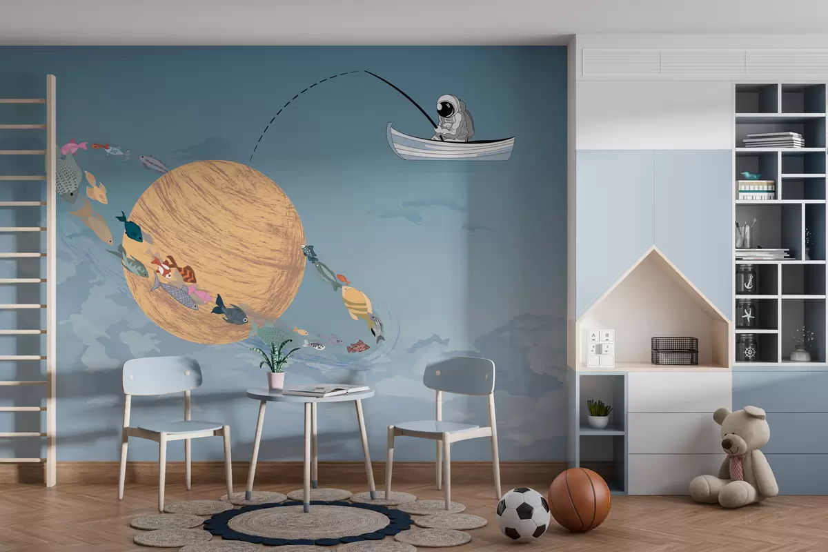 Stenske poslikave Astronavtska luna in riba v modri barvi Št. w00869v1