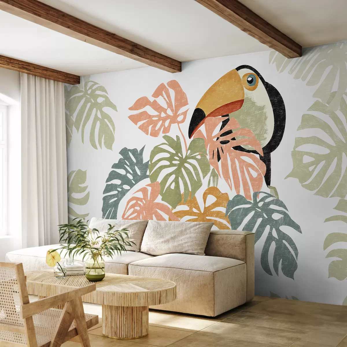 Stenske poslikave Tukan sedi v listju tropske pošasti, risba imitacije poteze Št. w01009