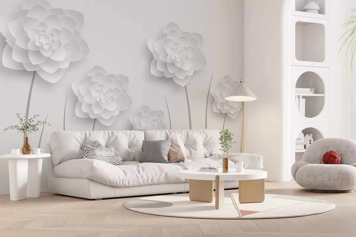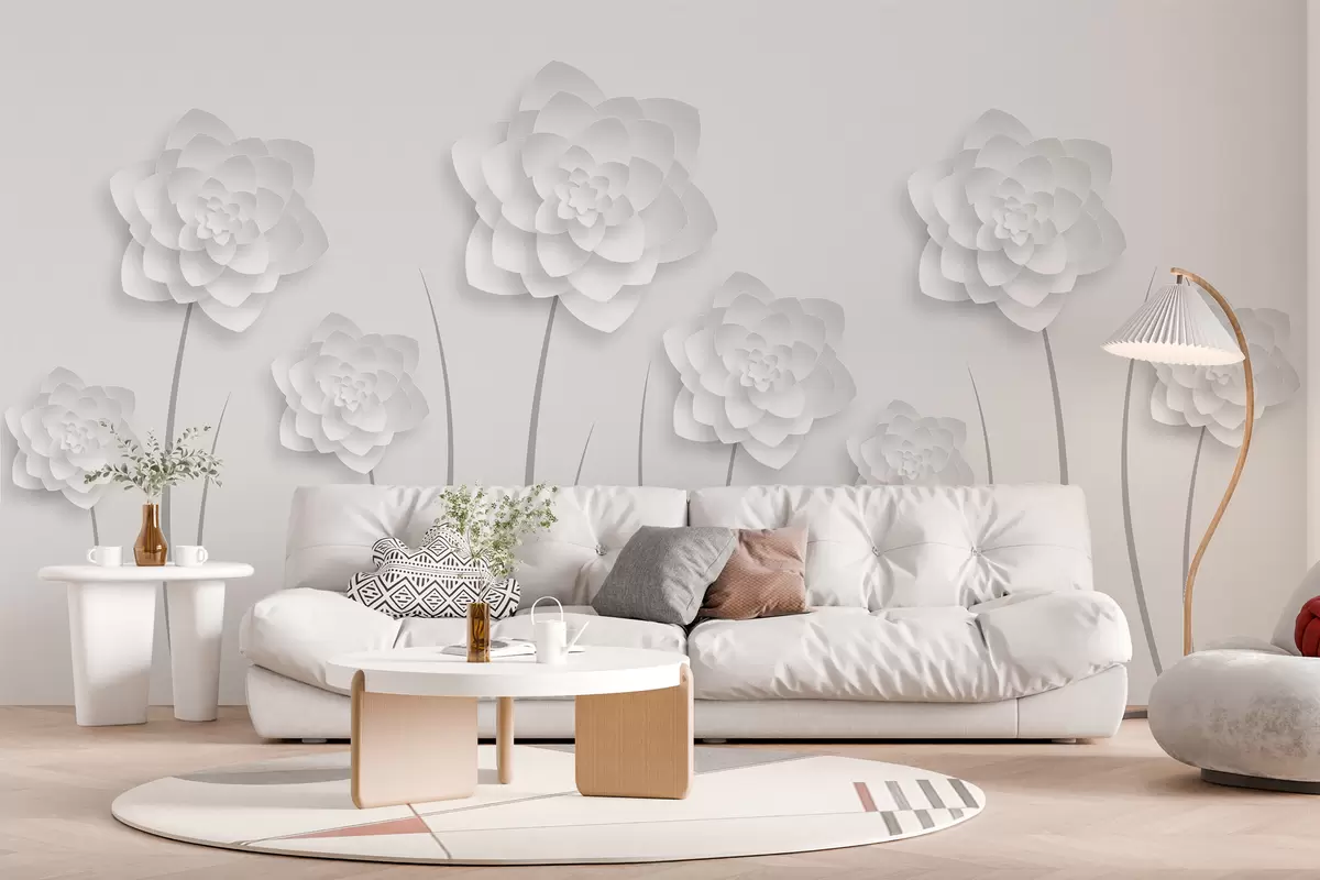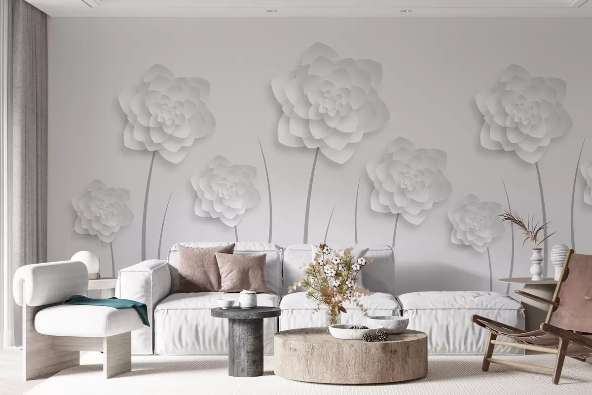 Stenske poslikave Veliki cvetovi z imitacijo volumna v slogu papirja na svetlo sivi podlagi s sivim steblom Št. w01021