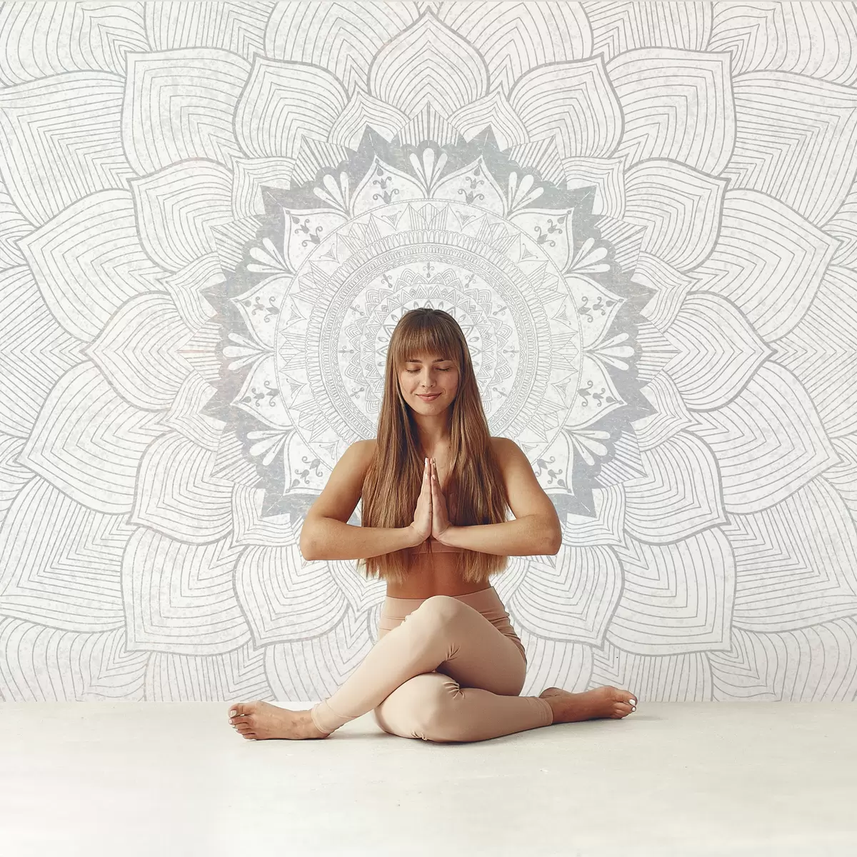 Stenske poslikave Okrogla mandala, ozadje za prostor za jogo ali za uskladitev osebnega prostora. Stenska mandala v sivih odtenkih na teksturiranem heterogenem ozadju Št. w01088v2
