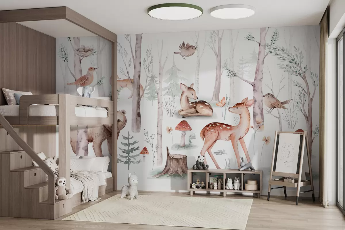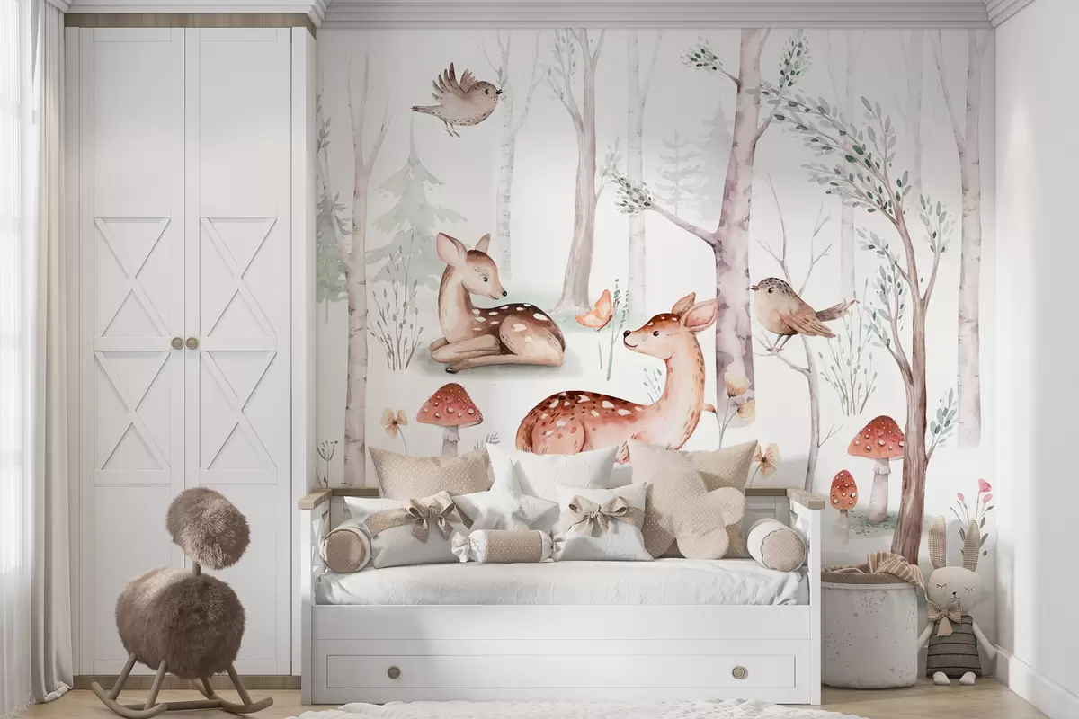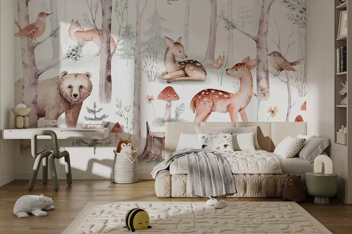 Stenske poslikave Ozadje za otroško sobo, gozdne živali. Nežno ozadje v stilu akvarela v prijetnih toplih pastelnih barvah na belem ozadju Št. w01089