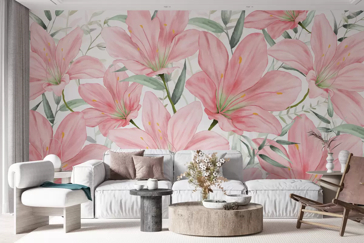 Stenske poslikave Velike bledo roza lilije in listi v akvarelnem slogu na belem ozadju Št. w01121