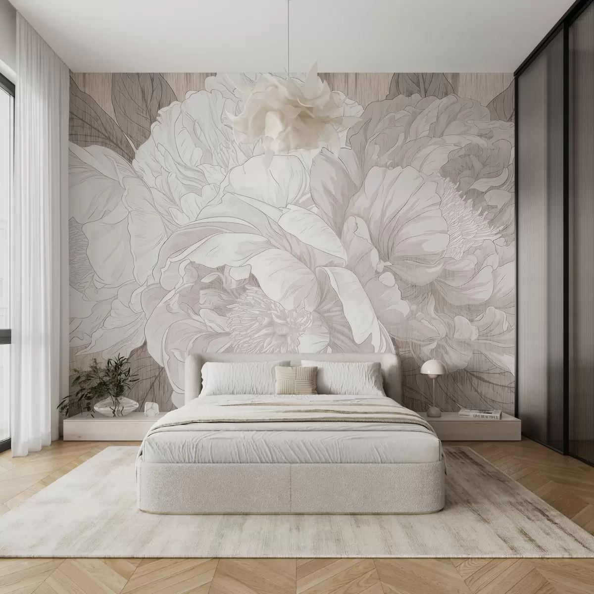 Stenske poslikave Teksturirani veliki cvetovi pivonik v bež odtenkih Št. w01141