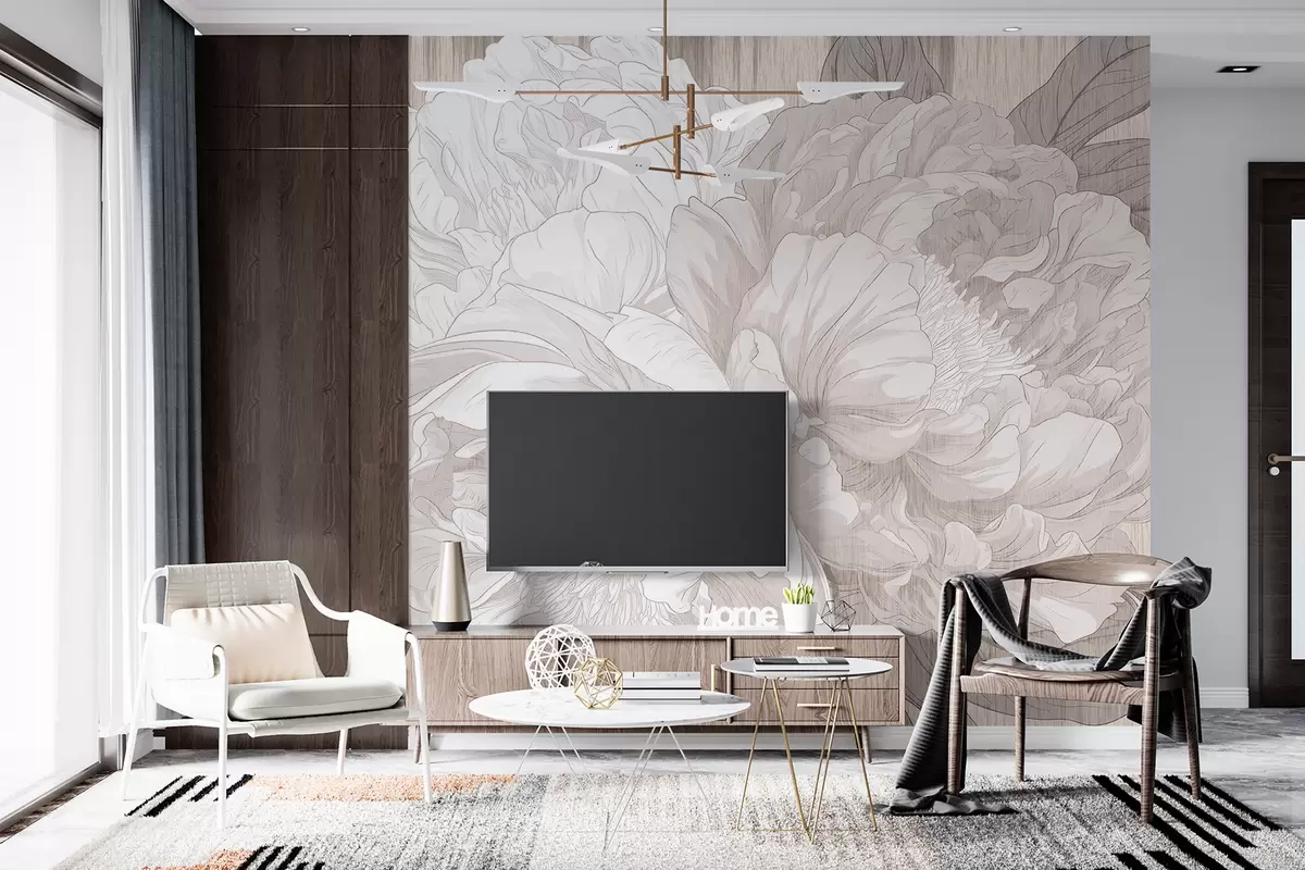 Stenske poslikave Teksturirani veliki cvetovi pivonik v bež odtenkih Št. w01141