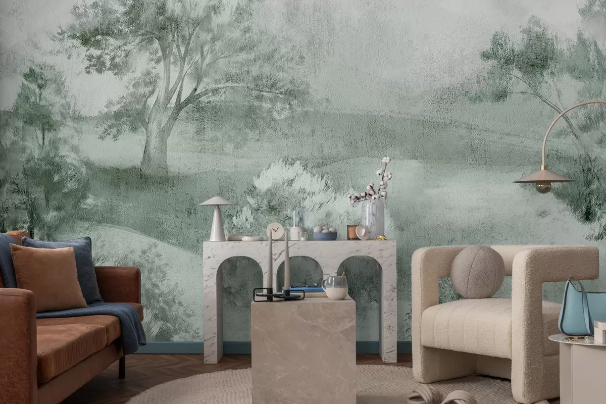 Stenske poslikave Krajinska slika meglenega podeželskega prizora, obdanega z bujnimi drevesi in listjem v modrih odtenkih Št. w01247v2