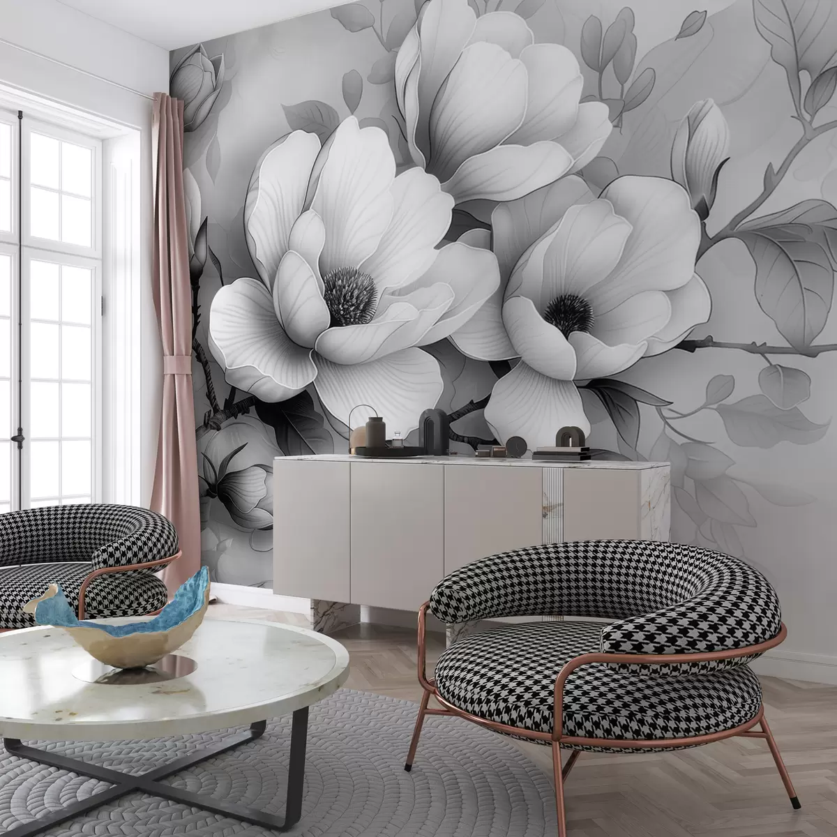 Stenske poslikave Črno-bela ilustracija magnolije na sivem ozadju Št. w01277