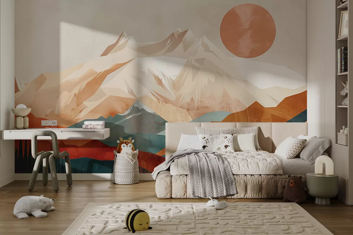 Stenske poslikave Boho blaženost: spokojna pokrajina gora, dreves in sonca Št. w01358