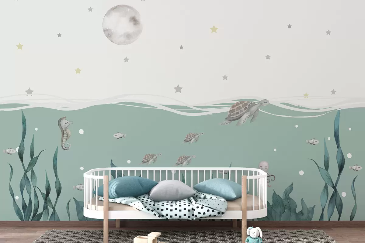 Stenske poslikave Morski motiv z želvami, morskim konjičkom, ribami in polno luno Št. w01521