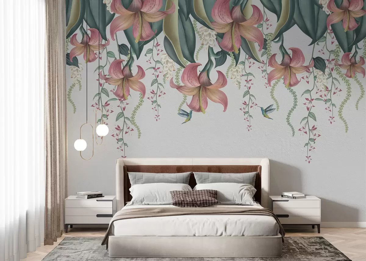 Stenske poslikave Nežen botanični motiv z visečimi lilijami, cvetovi in kolibriji na svetli steni Št. w01523v1