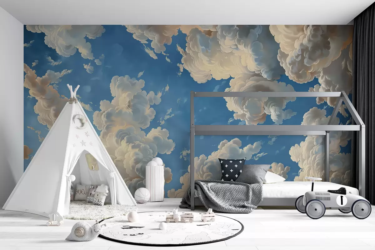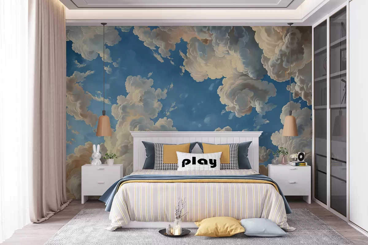 Stenske poslikave Razgibani oblaki v toplih tonih smetane, nežne breskve in bledo barve na ozadju globokega, živahno modrega neba Št. w01583