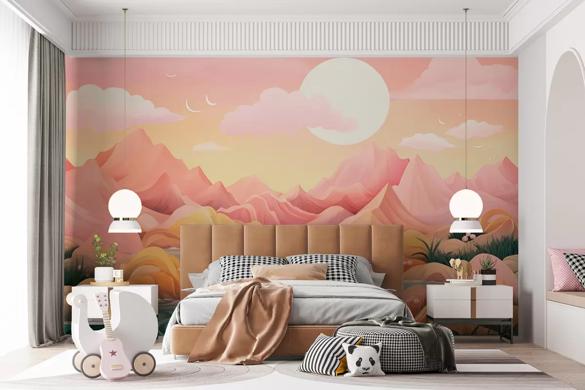 Stenske poslikave Fantastična, pastelno obarvana pokrajina z nežno rožnatimi in breskovimi gorami Št. w01656