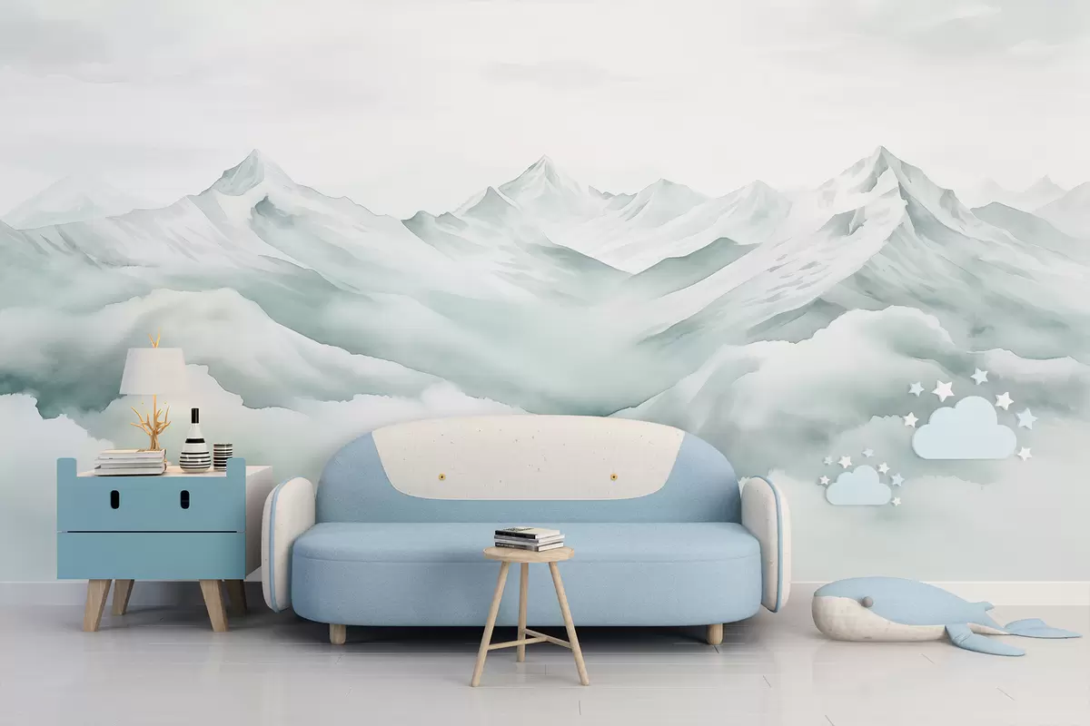 Stenske poslikave Gorska pokrajina, akvarel, mehke modre barve Št. w01787v2