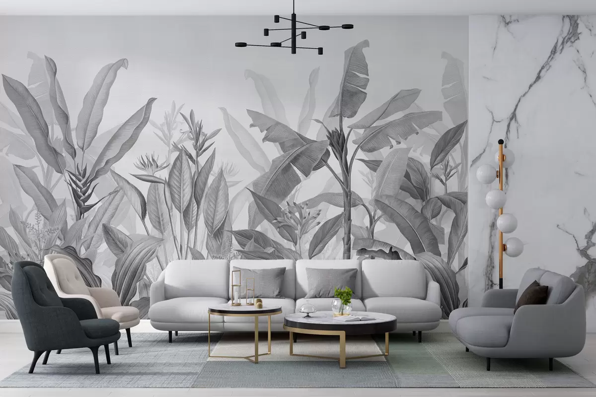 Stenske poslikave Črno-beli tropski listi in cvetje na svetlem ozadju Št. w01834v3