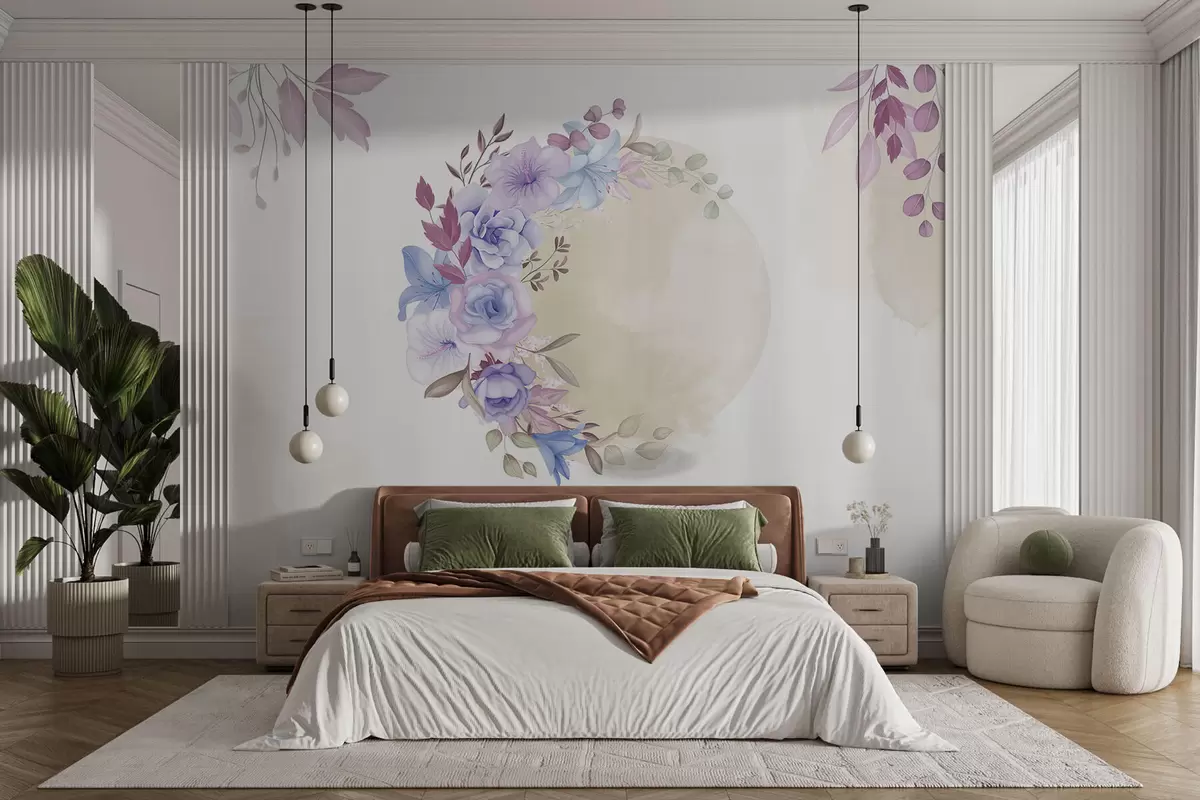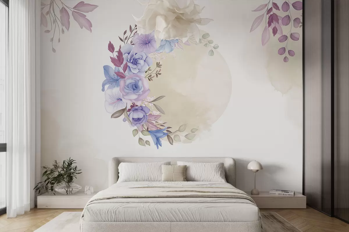Stenske poslikave Nežno cvetje v obliki polmeseca v akvarelnem slogu z bež lisami Št. w01874
