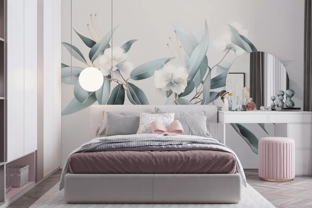 Stenske poslikave Bombažno cvetje, narava, akrilna risba, mehke sive barve Št. w01884