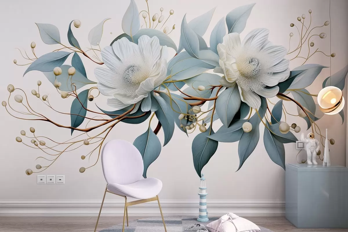 Stenske poslikave Lepo akrilno cvetje z listi in jagodami, realizem Št. w01887