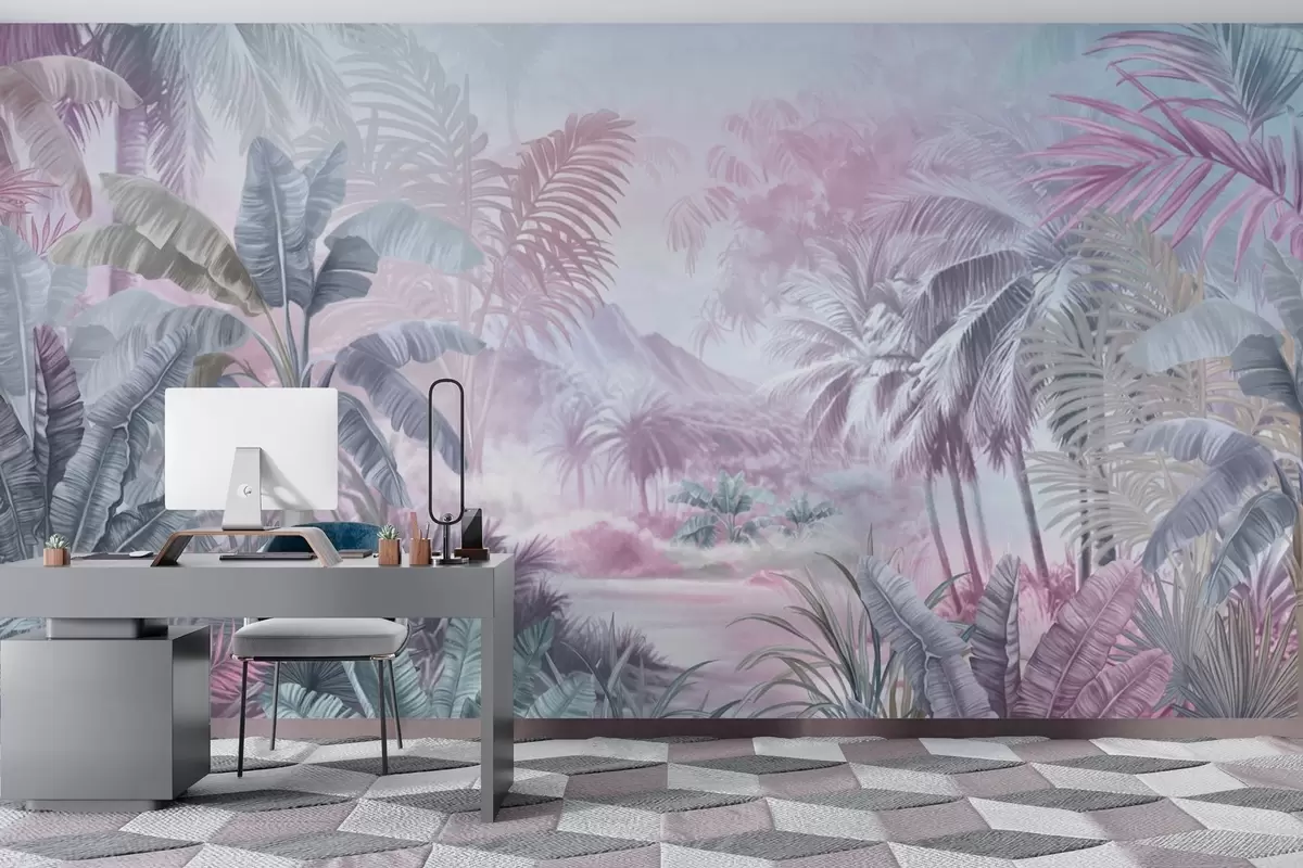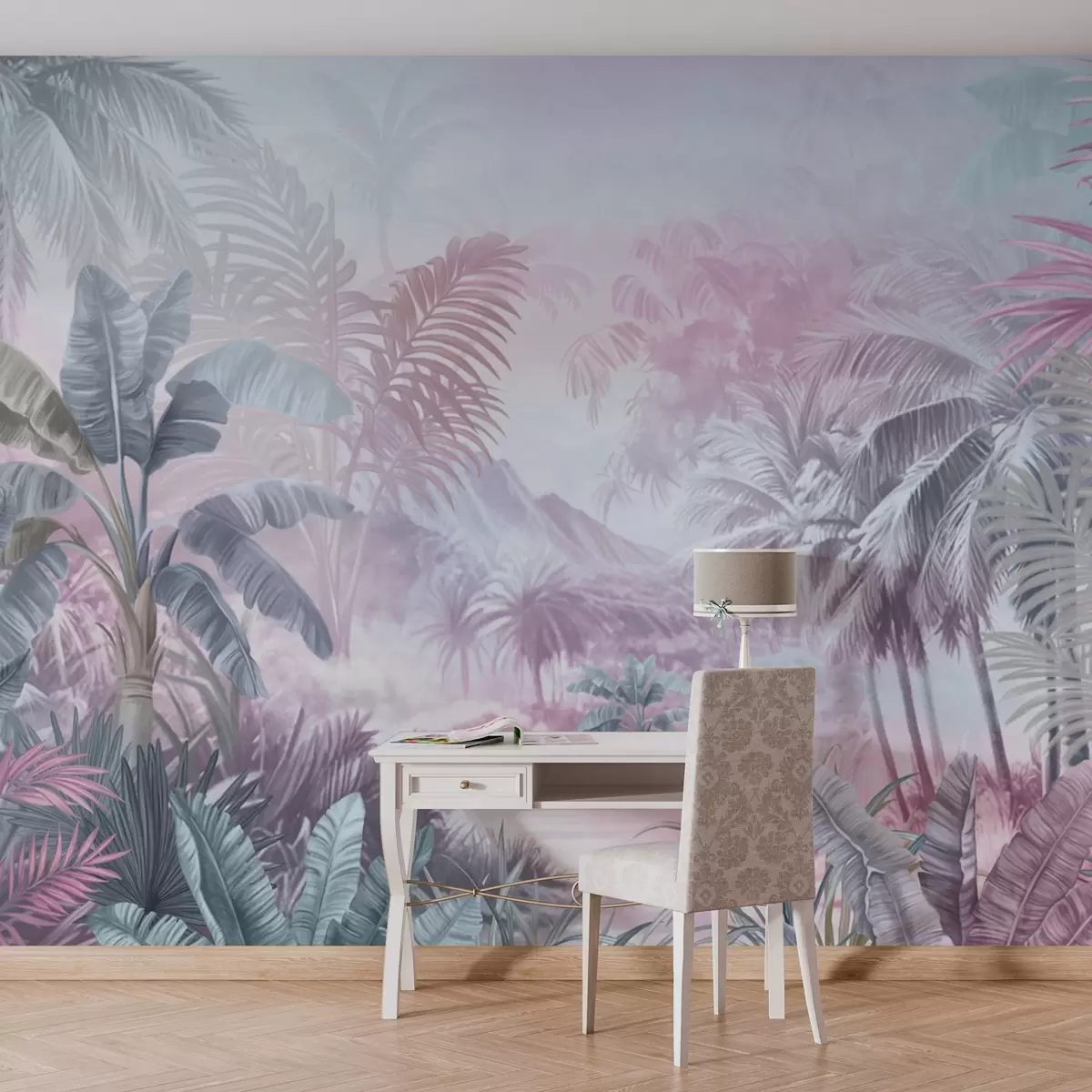 Stenske poslikave Deževni gozd v nežnih modrih in rožnatih tonih Št. w01931v2