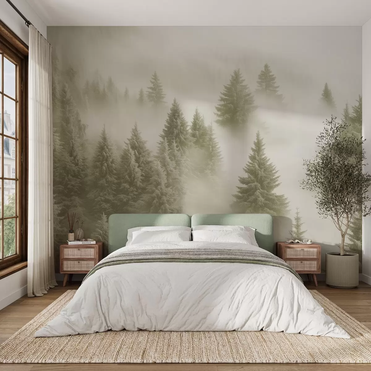 Stenske poslikave Gosta megla, ki ovija zasnežen jutranji gozd v nežnih zelenih odtenkih Št. w02064v2