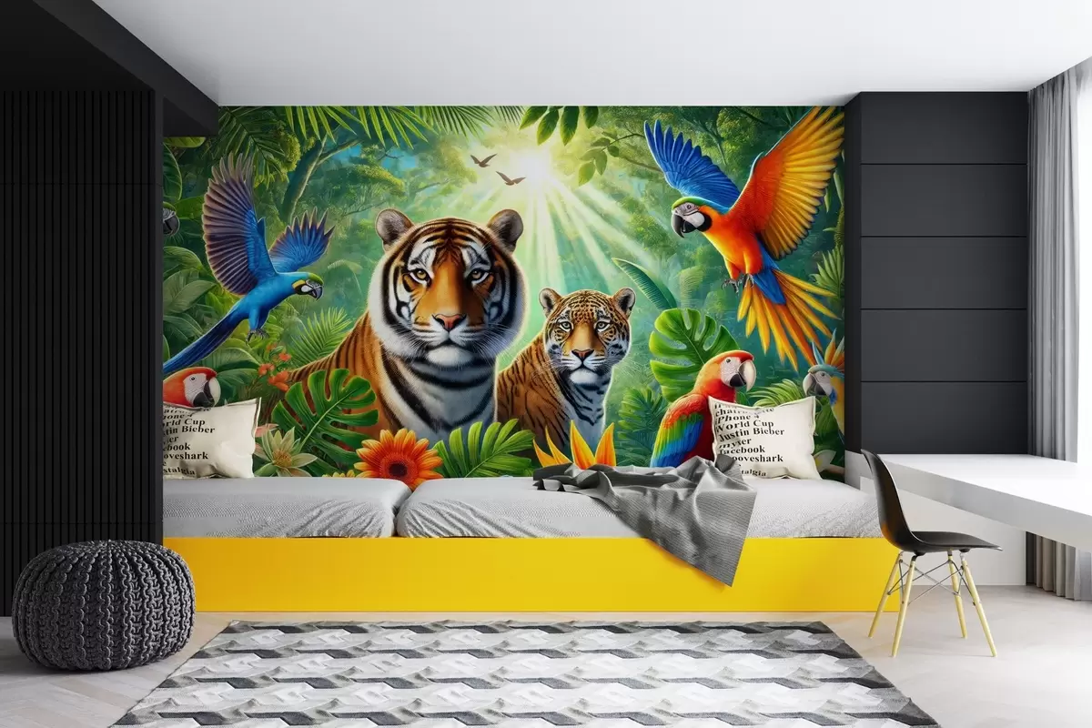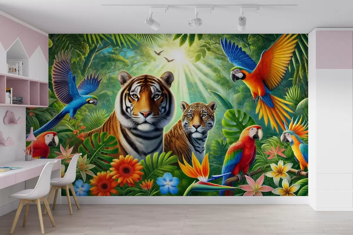 Stenske poslikave Barvita stenska poslikava s panoramo tropov s parom tigrov, papig in rož Št. w02083