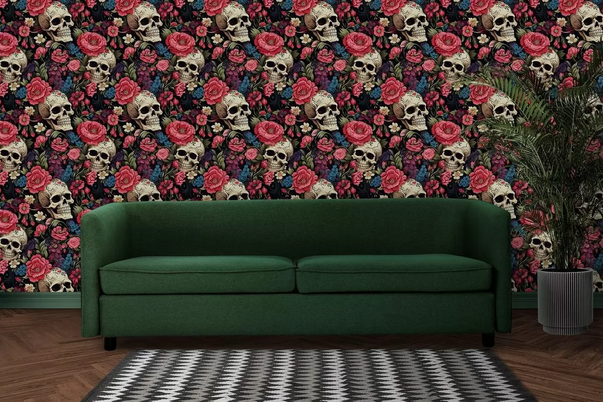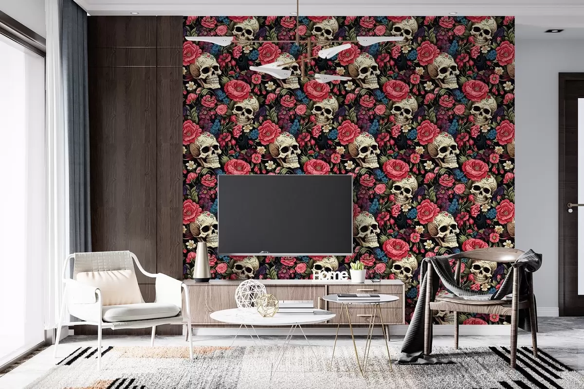 Stenske poslikave Mistični retro slog ozadje z vzorcem lobanje in cvetovi v rožnatih tonih na temnem ozadju Št. w02084