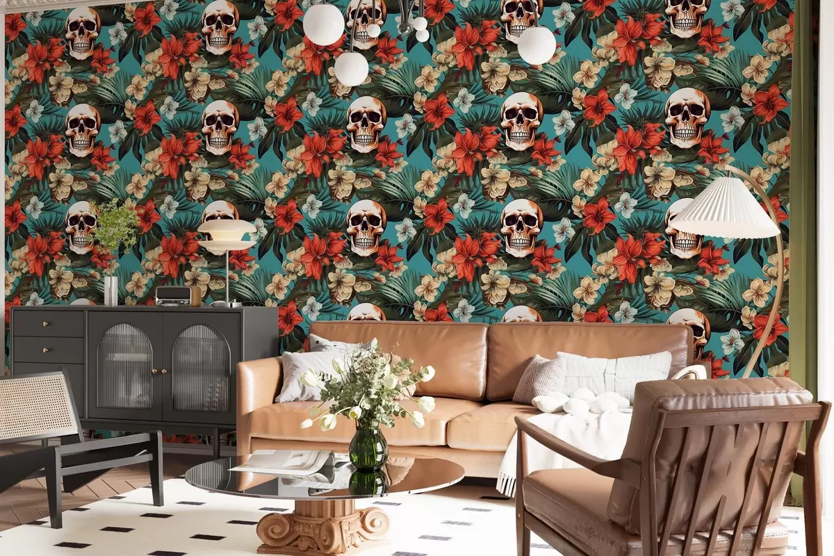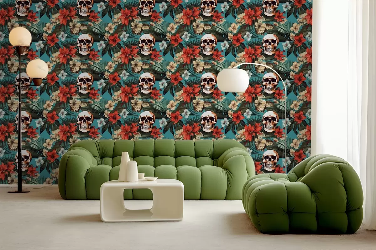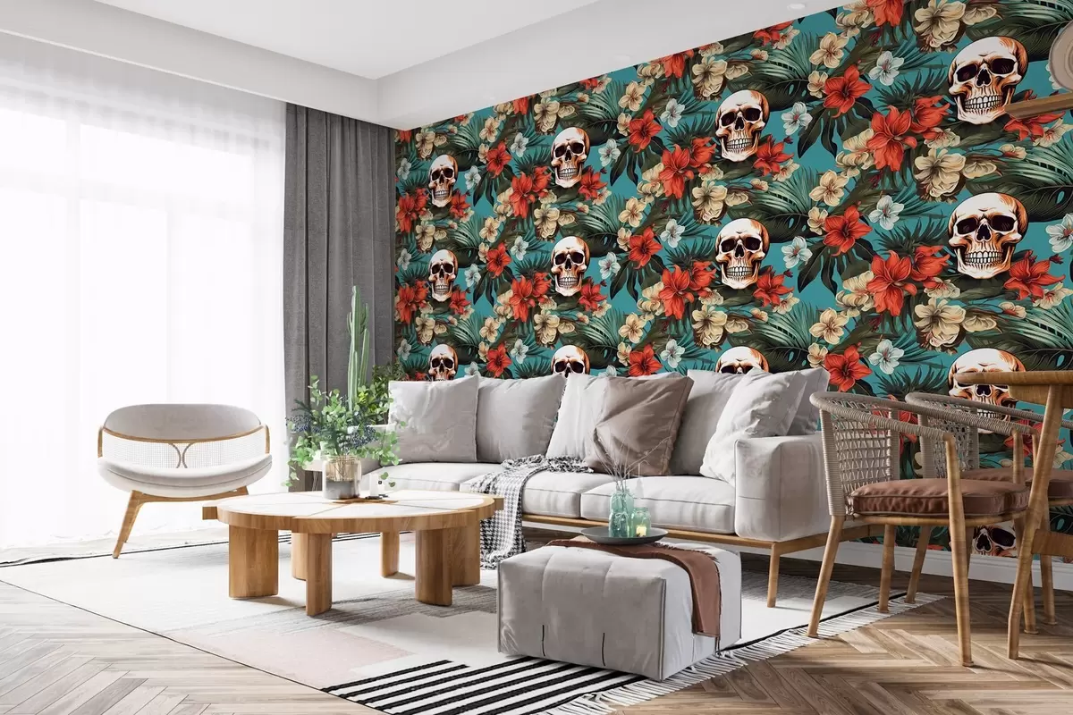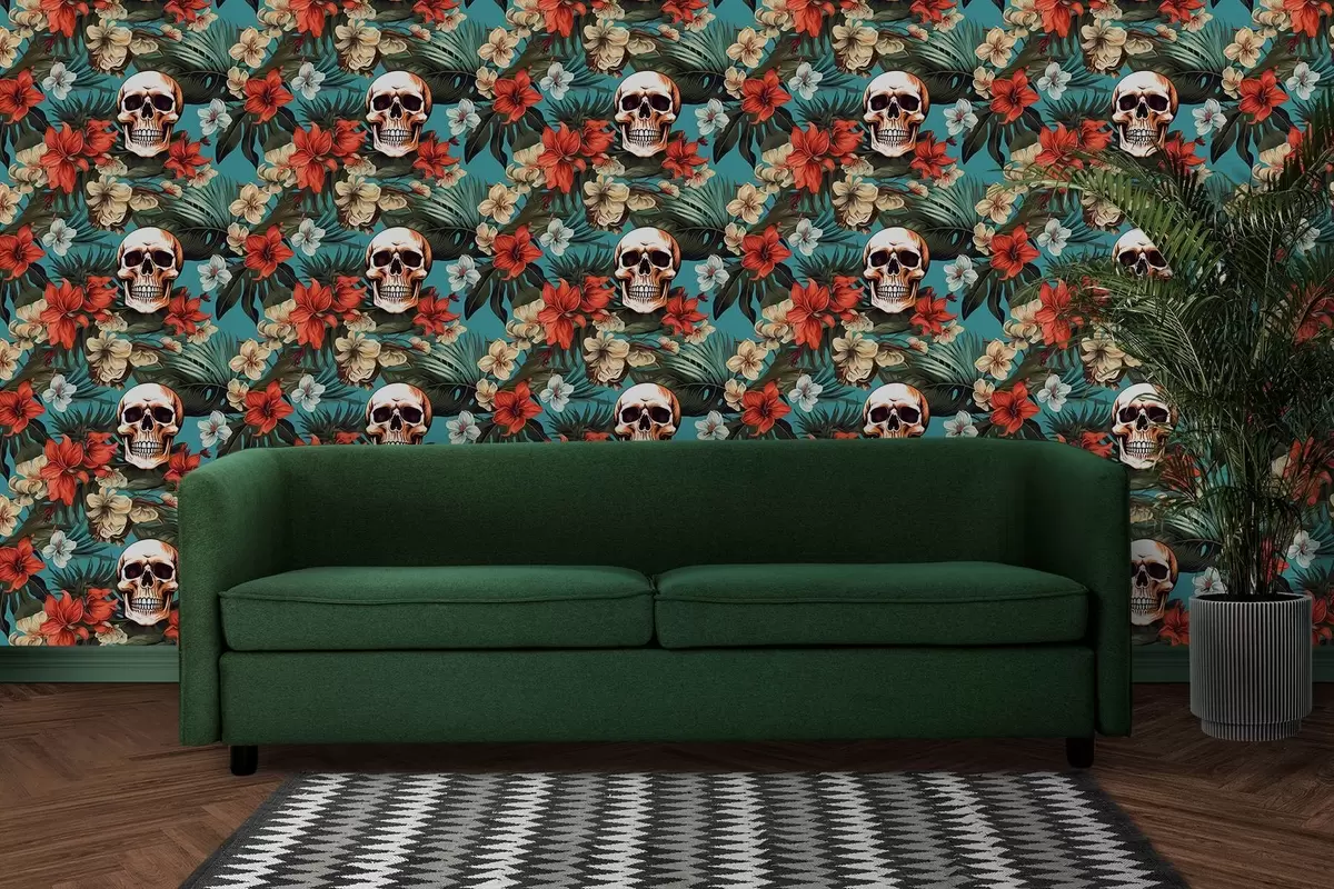 Stenske poslikave Vzorec v tropskih preprogah s cvetjem in lobanjami Št. w02122