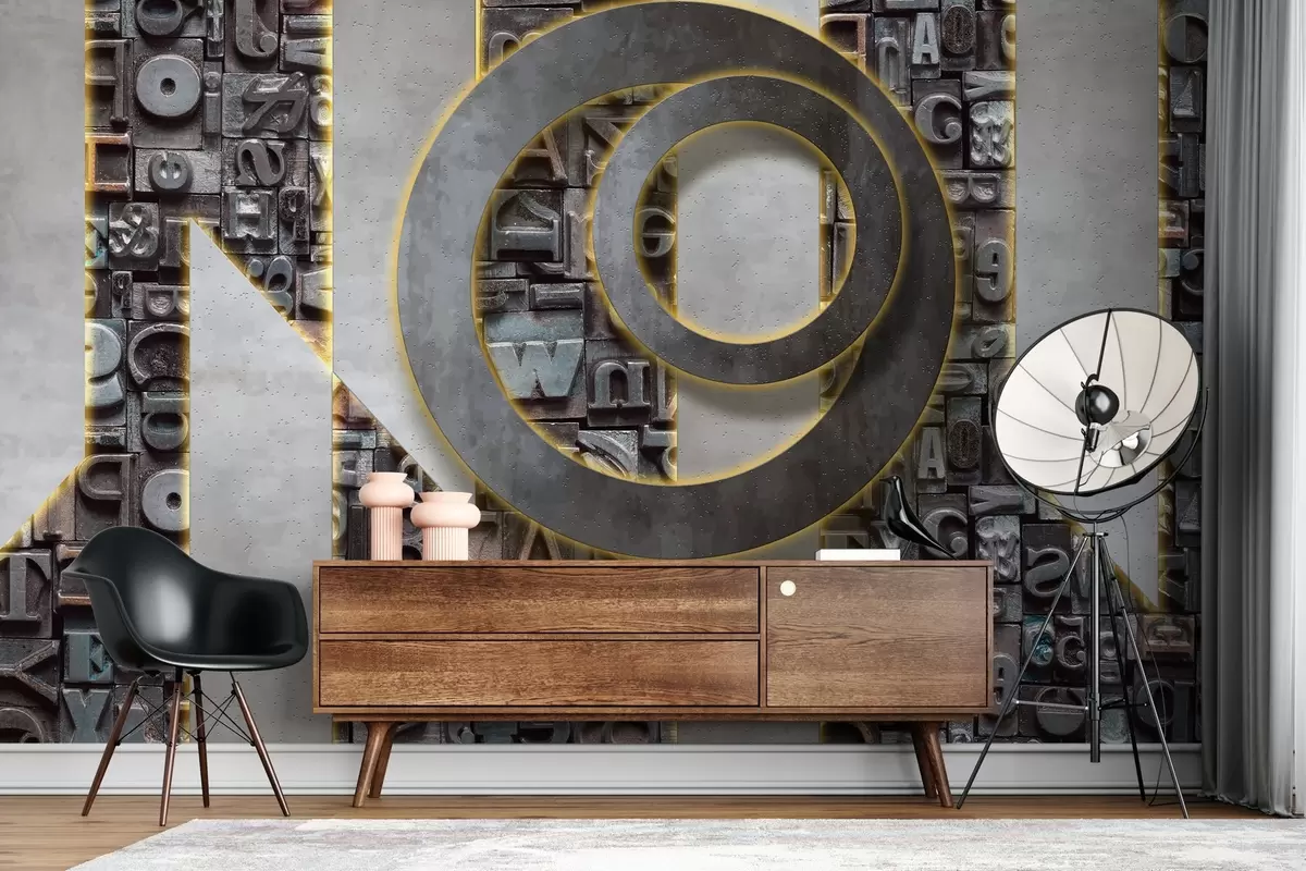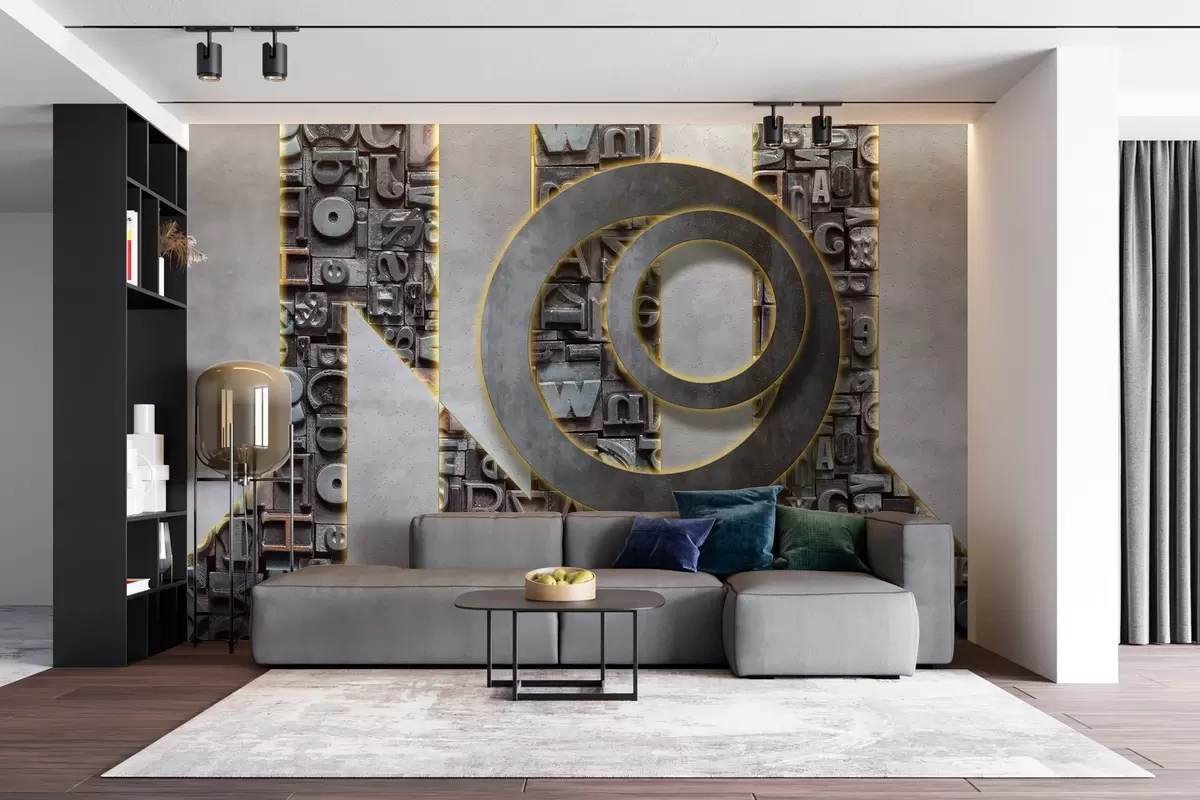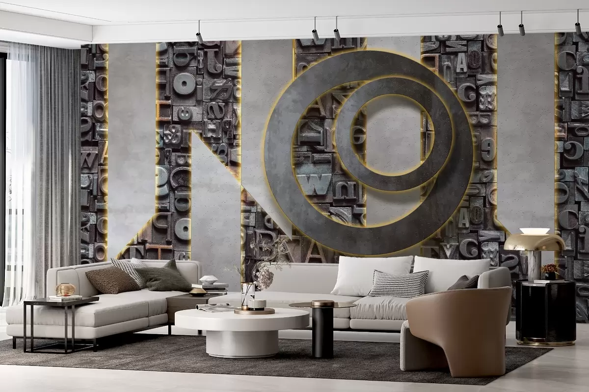Stenske poslikave Sodobna tapeta v mansardnem slogu z imitacijo tridimenzionalnih črk, betona in osvetlitve Št. w02125