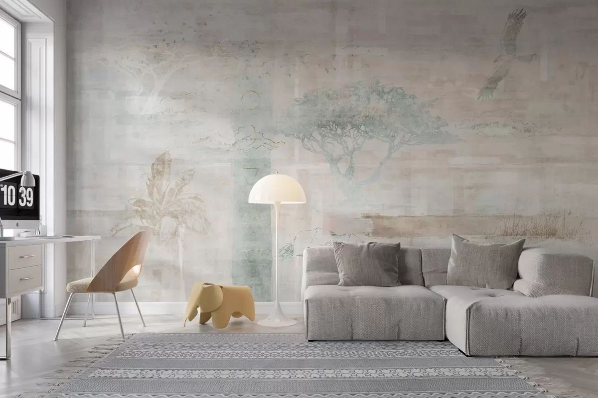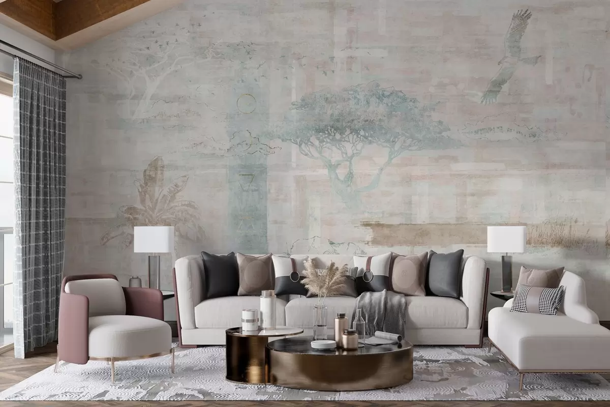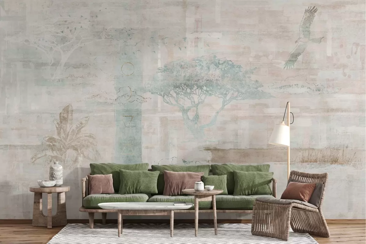 Stenske poslikave Vintage grunge učinek z drevesi, orlom in geometrijskimi elementi Št. w02130