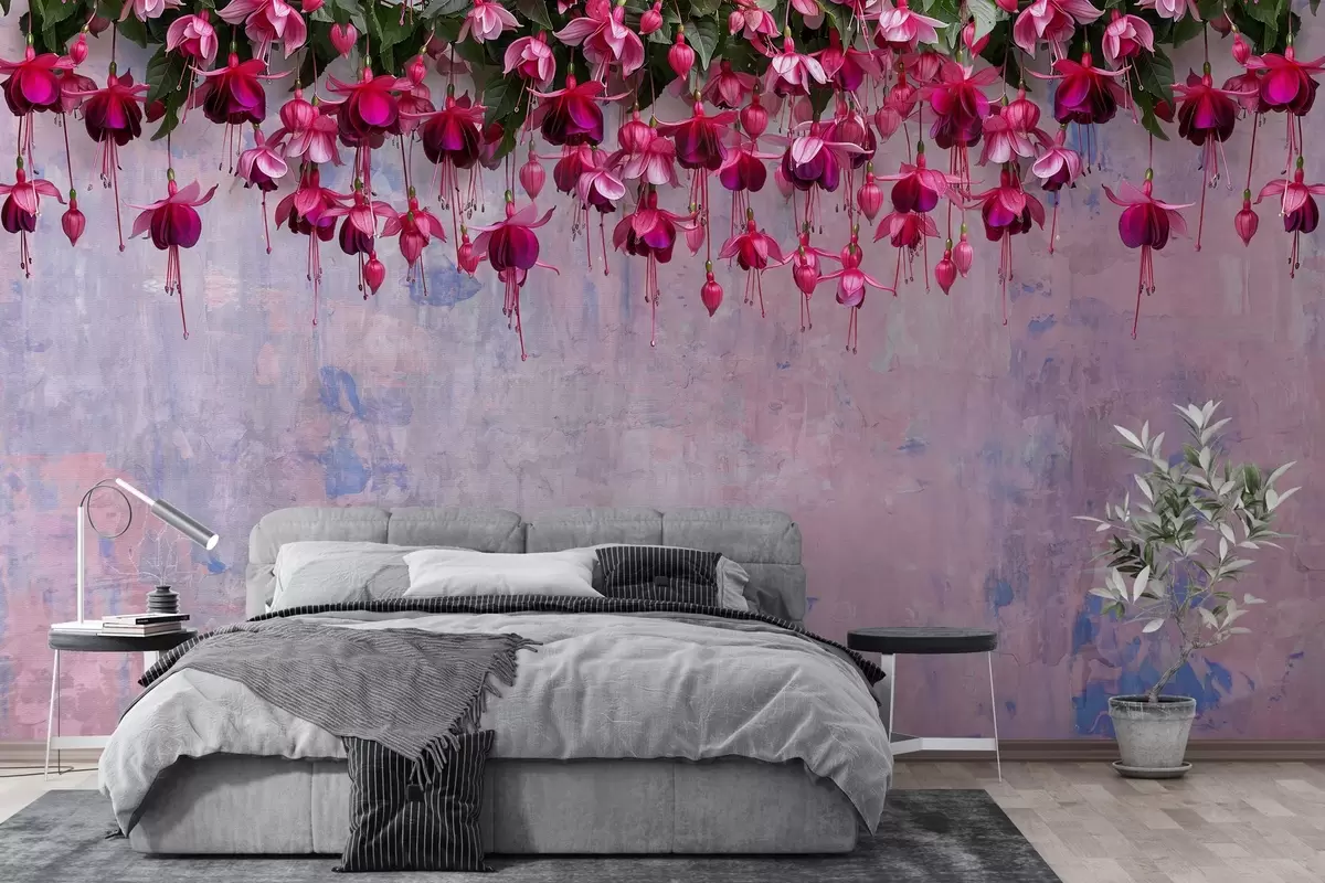 Stenske poslikave Veliki cvetovi fuksije, ki visijo od zgoraj na ozadju retro stene z imitacijo odrgnin Št. w02132