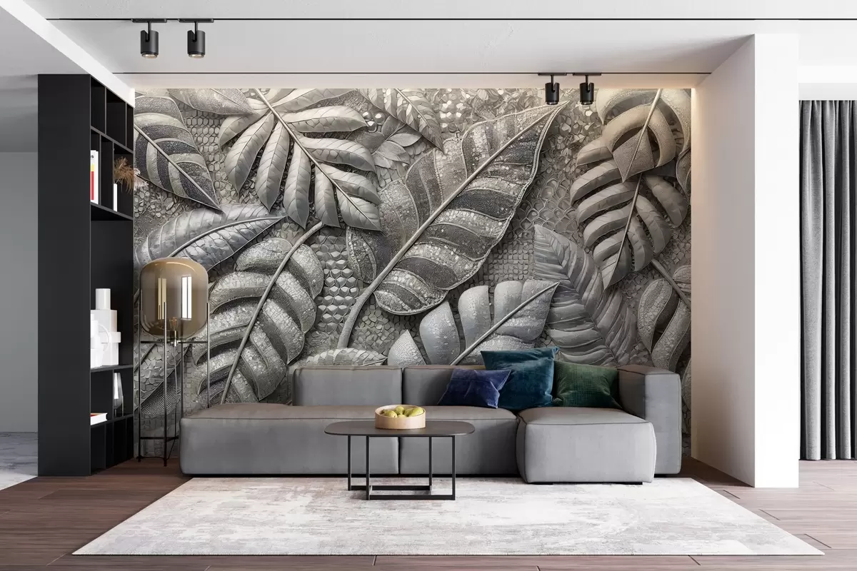 Stenske poslikave Veliki tropski listi v nežnih srebrnih odtenkih, v teksturiranem mozaičnem slogu Št. w02135