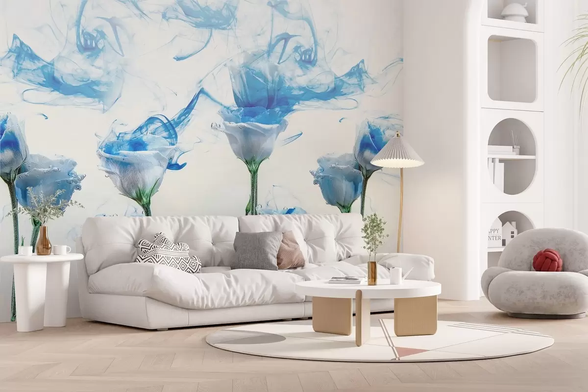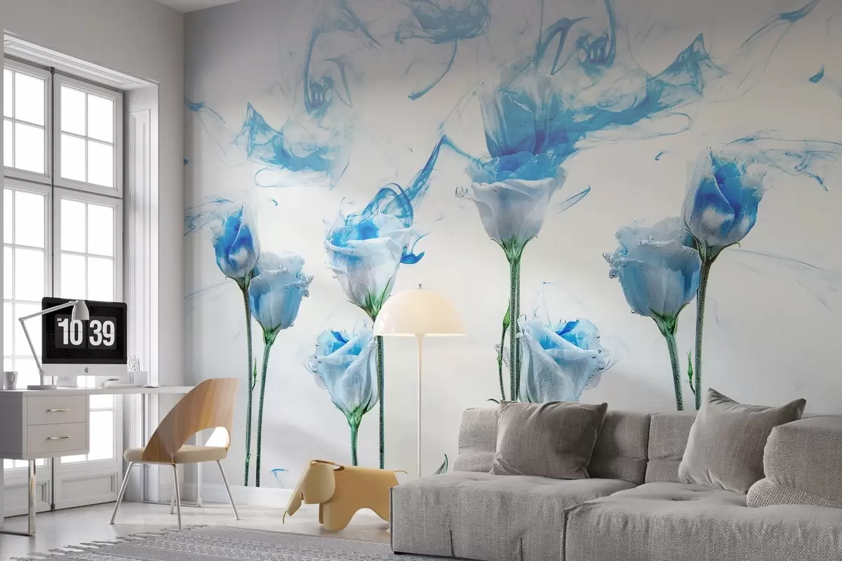 Stenske poslikave Bele vrtnice pod vodo na belem ozadju z modrimi progami akrilne barve. Št. w02139