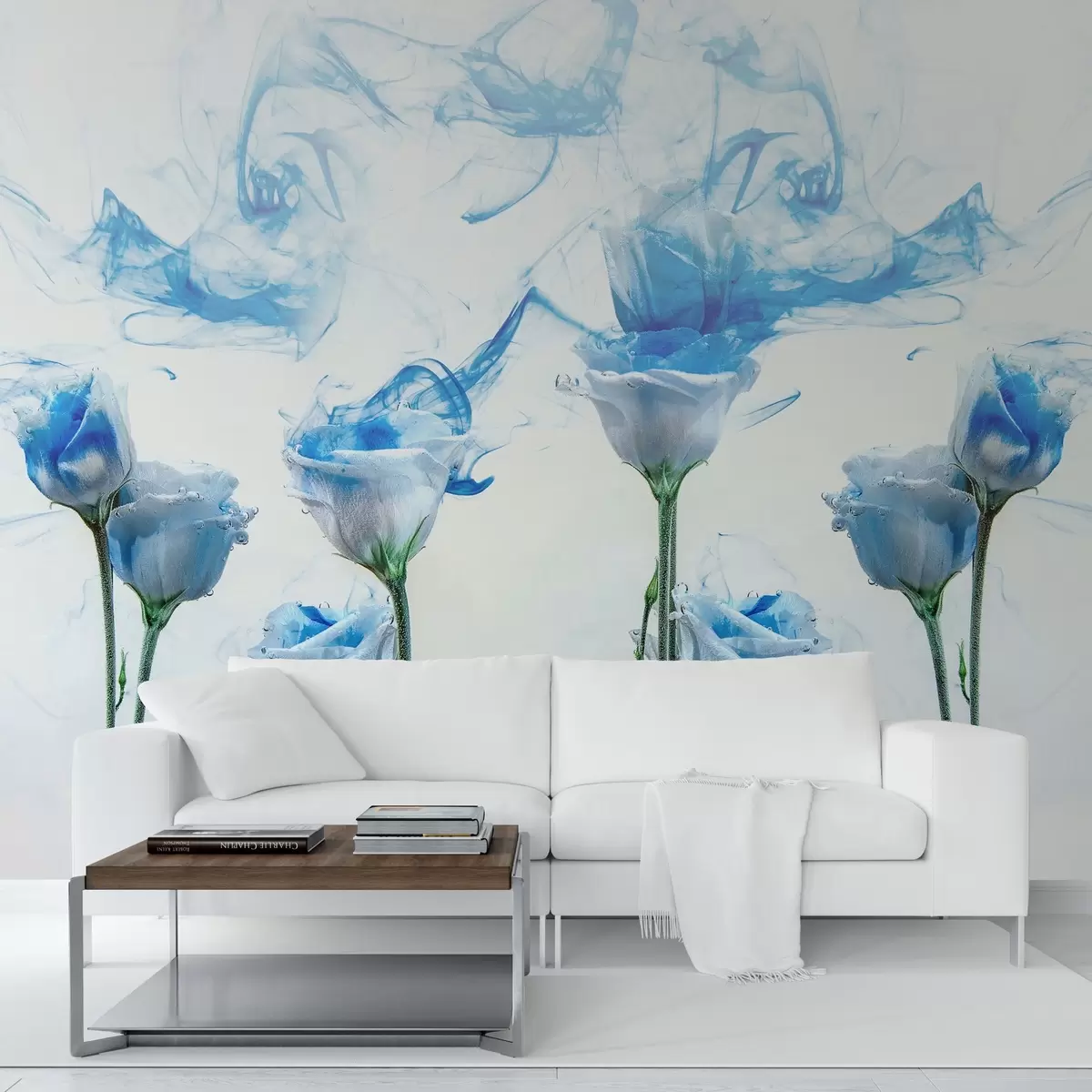 Stenske poslikave Bele vrtnice pod vodo na belem ozadju z modrimi progami akrilne barve. Št. w02139