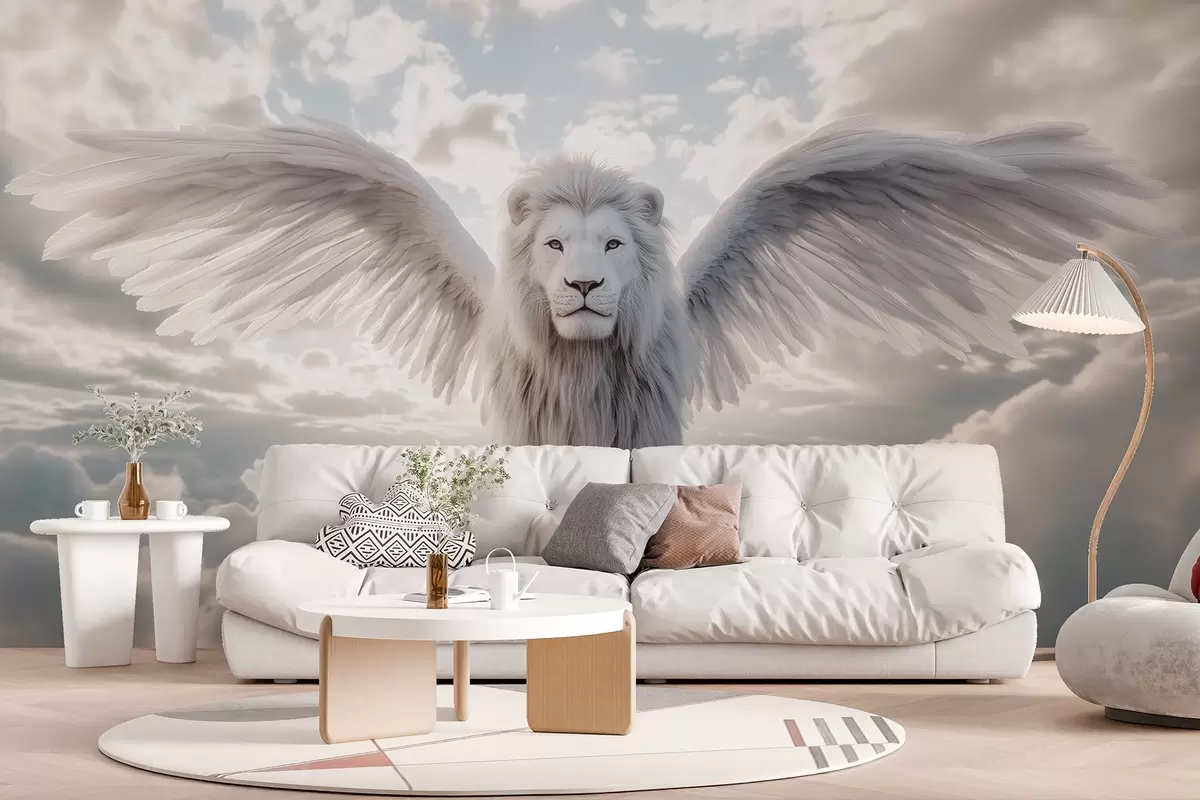 Stenske poslikave Veličasten bel lev s čudovito bujno belo grivo in krili na nebu v sivih barvah Št. w02144v1