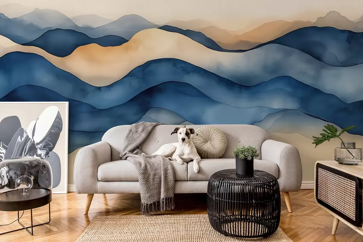 Stenske poslikave Abstraktni modro-beljasti valovi, ki spominjajo na gore Št. w02196