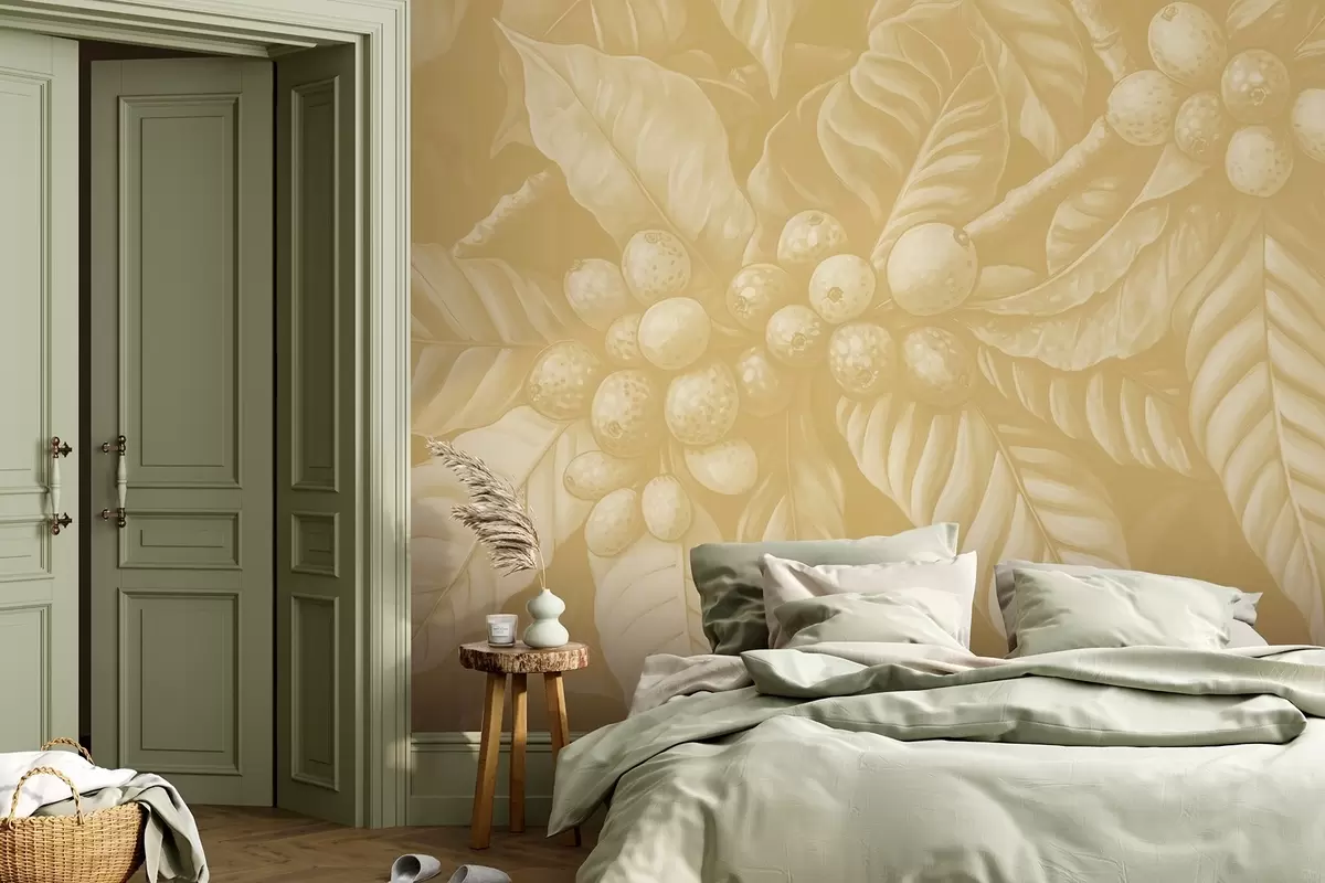 Stenske poslikave Veje kavovca s sadjem in tropskimi elementi v bež odtenkih Št. w02209v1
