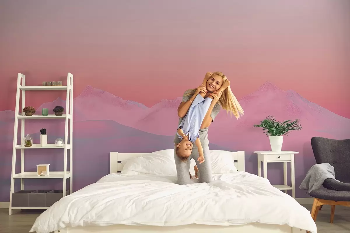 Stenske poslikave Mehak malinov sončni zahod v ozadju gora in neba Št. w02234