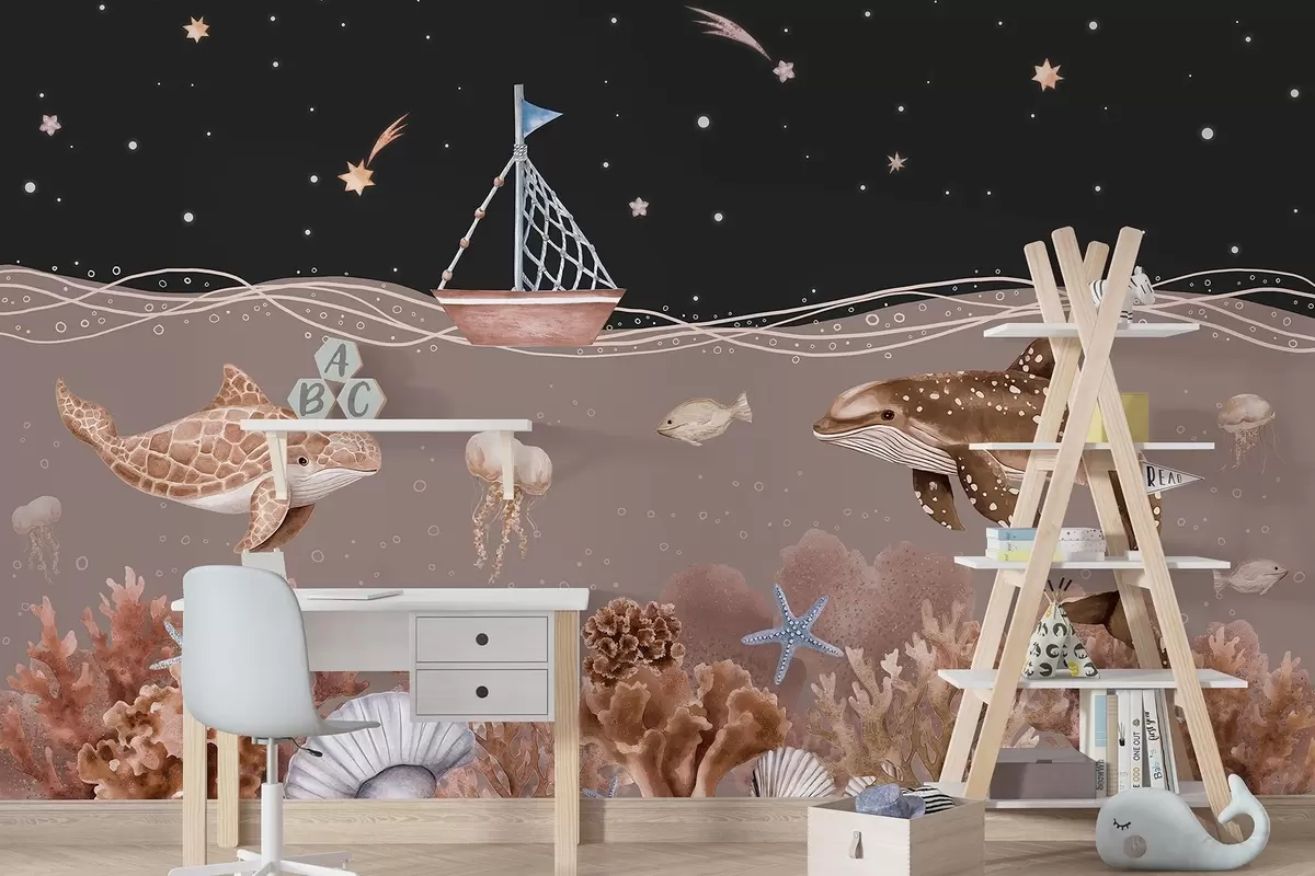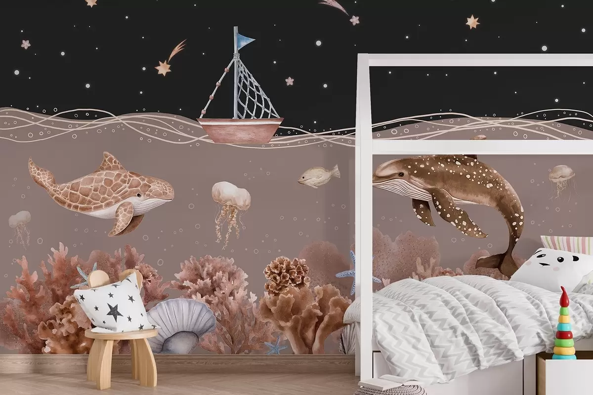 Stenske poslikave Morsko življenje, akvarel, korale, čoln, delfin, meduza, zvezdnato nočno nebo, bež barve Št. w02310v1