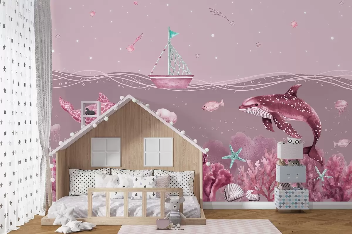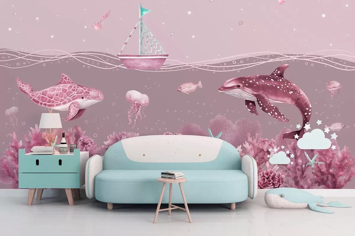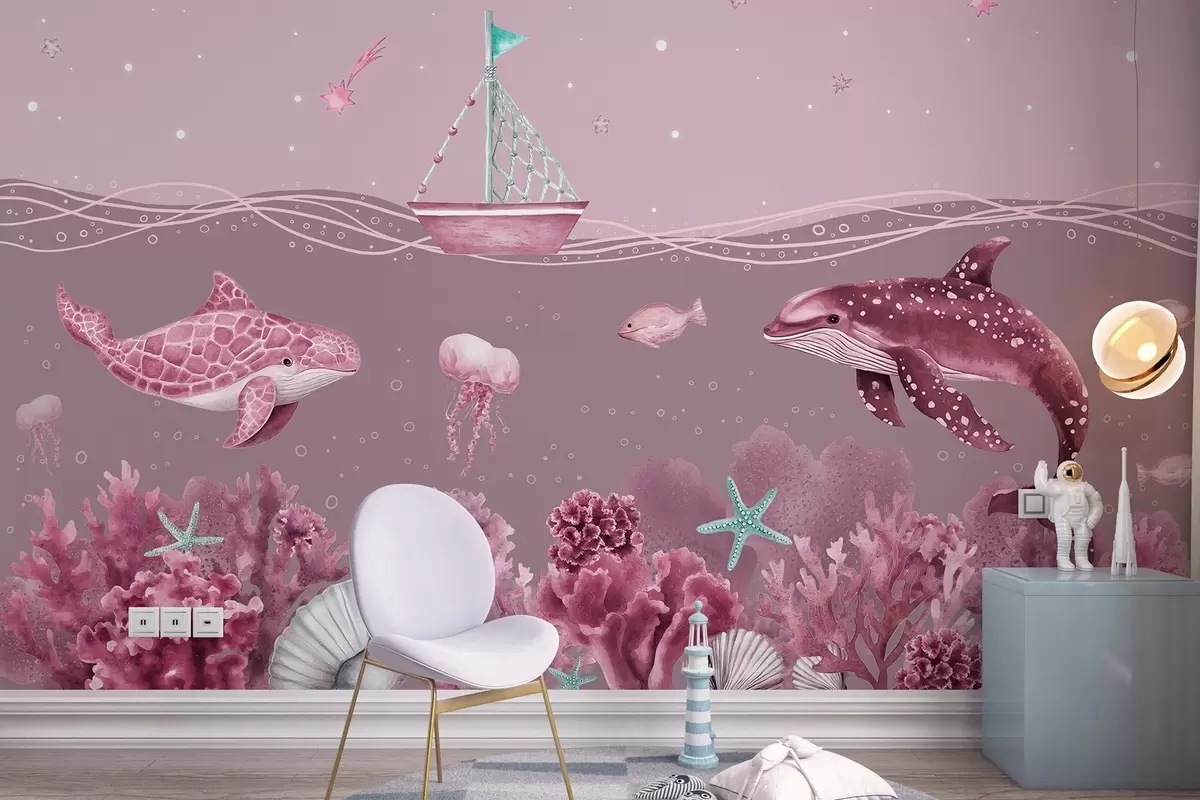 Stenske poslikave Morsko življenje, akvarel slog, korale, čoln, delfin, meduza, zvezdnato nebo, roza barve Št. w02310v2