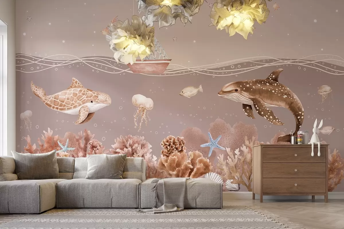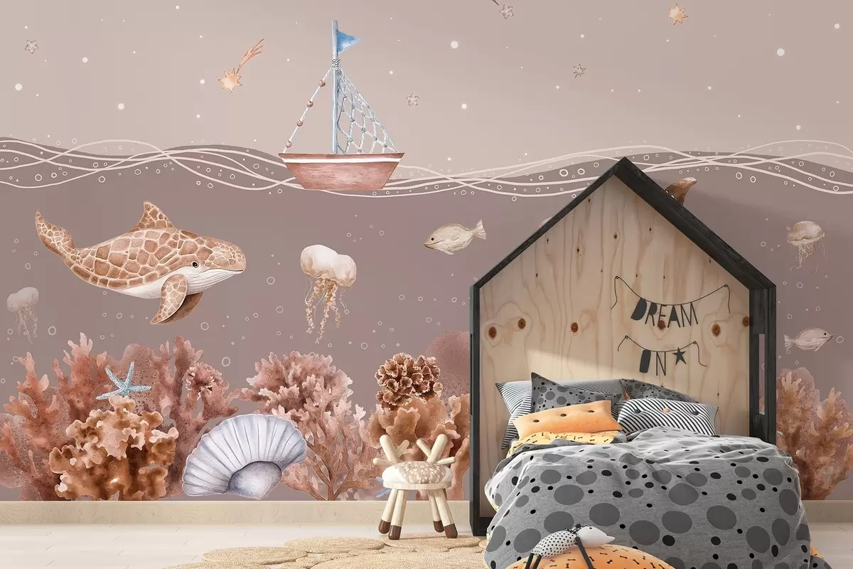 Stenske poslikave Morsko življenje, akvarel, korale, čoln, delfin, meduza, zvezdnato nebo, bež barve Št. w02310v4