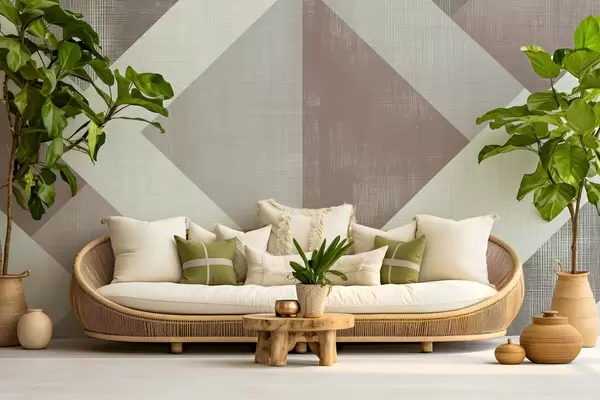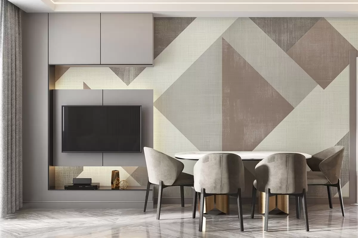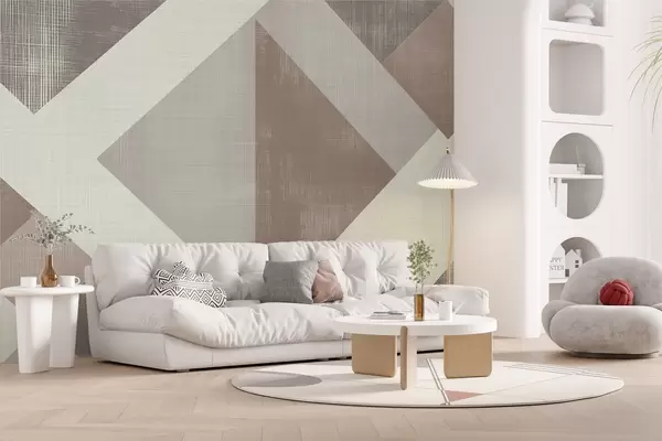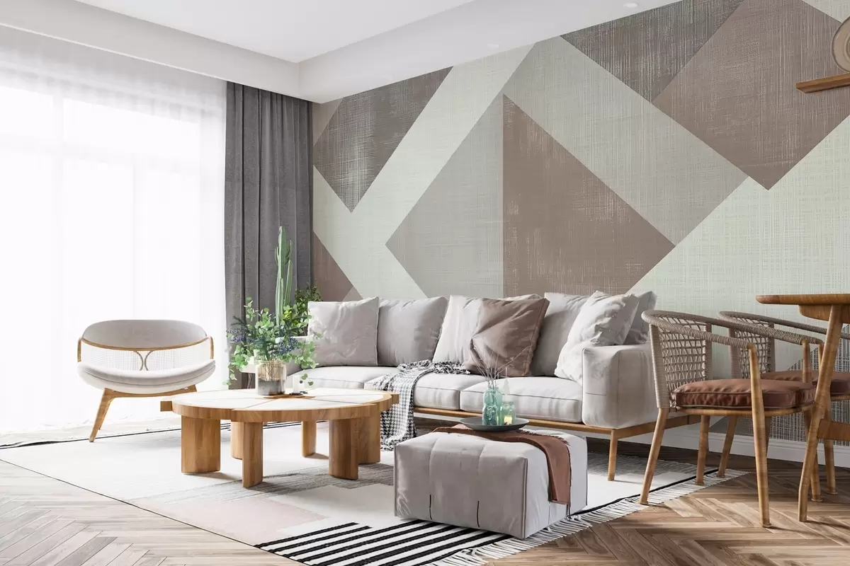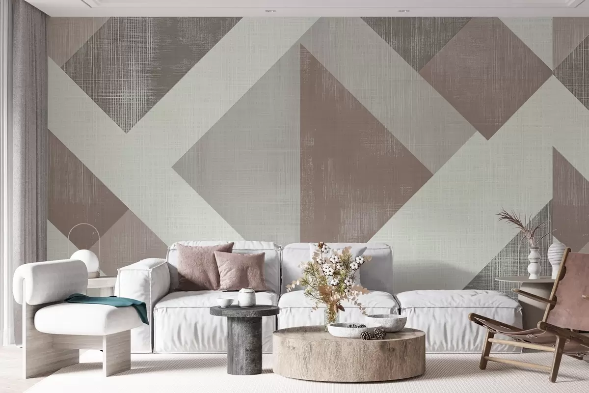 Stenske poslikave Sodobna geometrijska tapeta s prekrivajočimi se oblikami v mehkih bež, zelenih in sivih tonih Št. w02341v1
