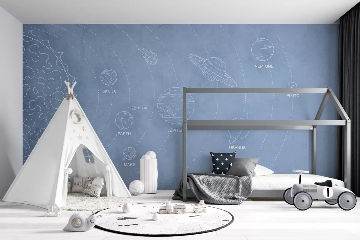 Stenske poslikave Sončni sistem v minimalističnem slogu na modrem teksturiranem ozadju Št. w02344v1