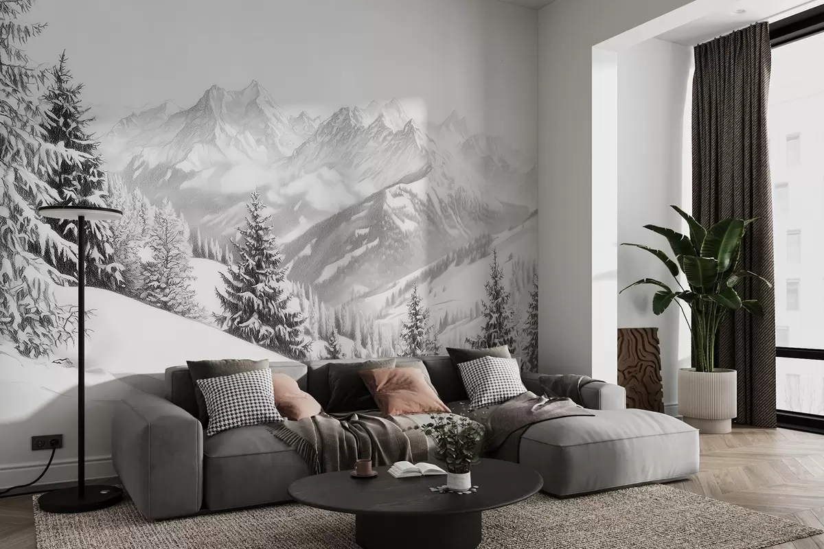 Stenske poslikave Zima v gorah, gozd, Alpe, risba s svinčnikom, naravne pokrajine Št. w02353