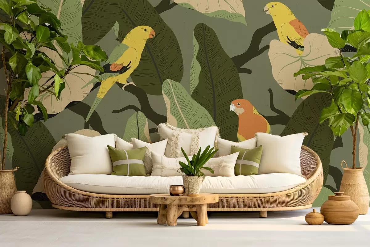 Stenske poslikave tropski listi s papagaji Št. w02402