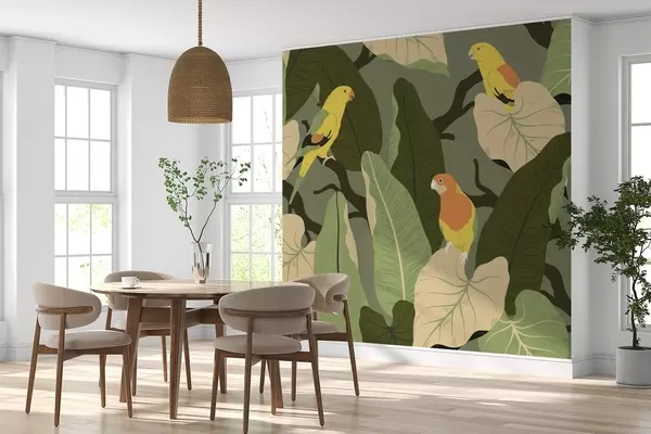 Stenske poslikave tropski listi s papagaji Št. w02402