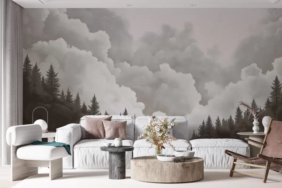 Stenske poslikave Naslikani debeli oblaki nad gozdom v oljnem slogu Št. w02411v1