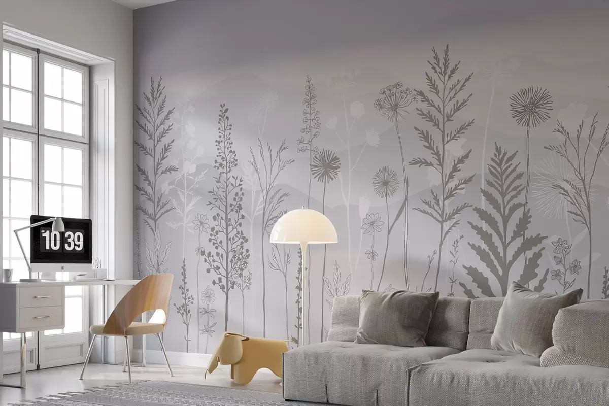 Stenske poslikave ozadje v ekološkem slogu, divje cvetlice v sivih tonih Št. w02443
