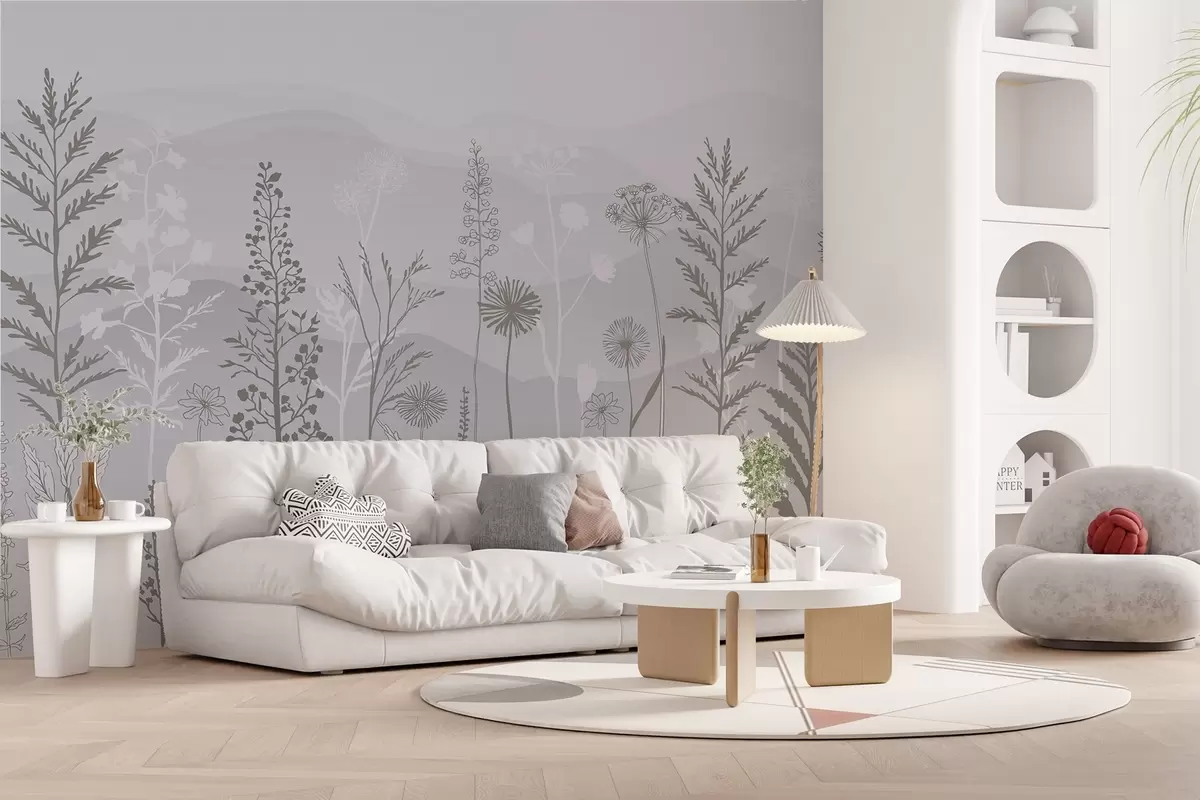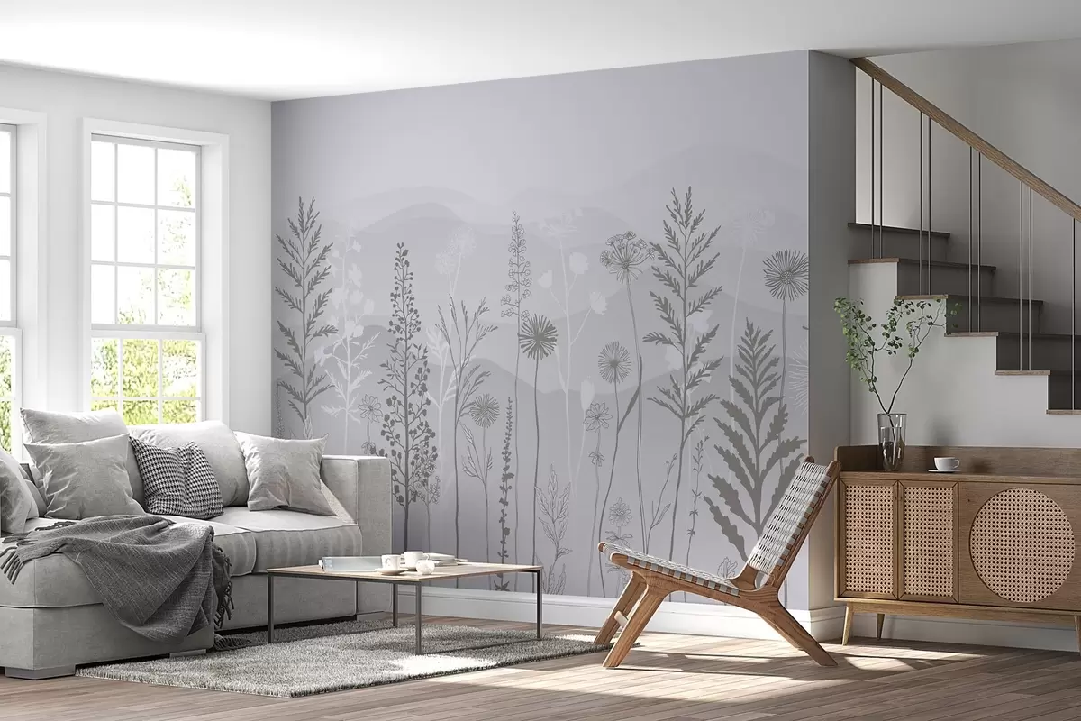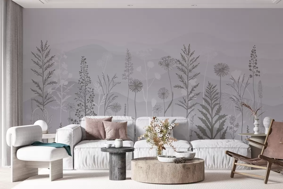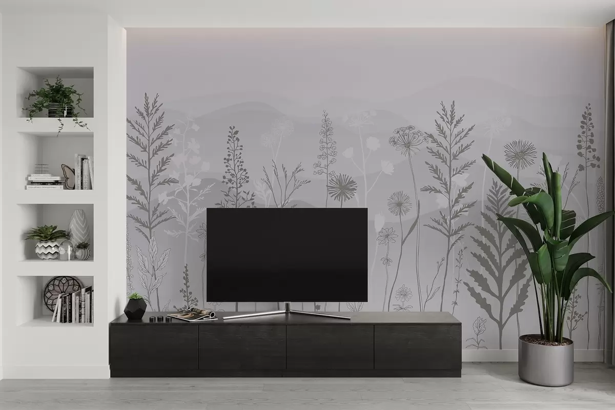 Stenske poslikave ozadje v ekološkem slogu, divje cvetlice v sivih tonih Št. w02443