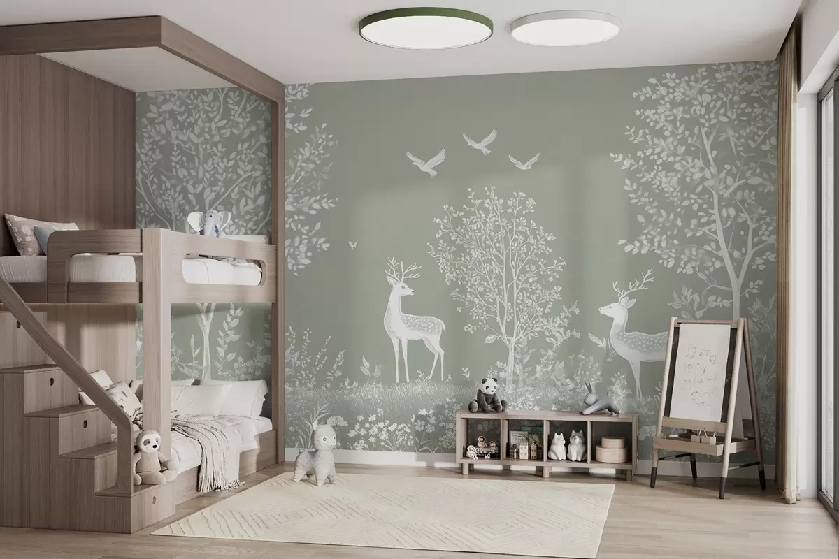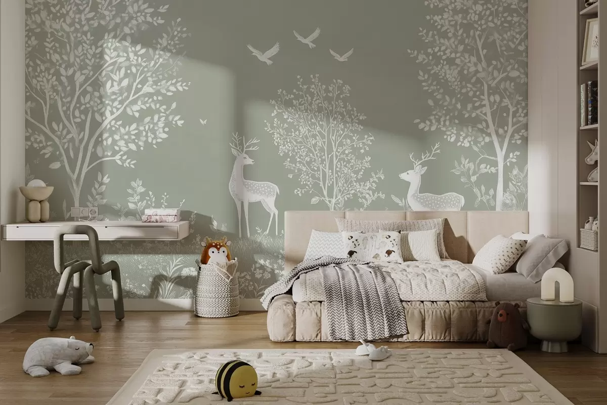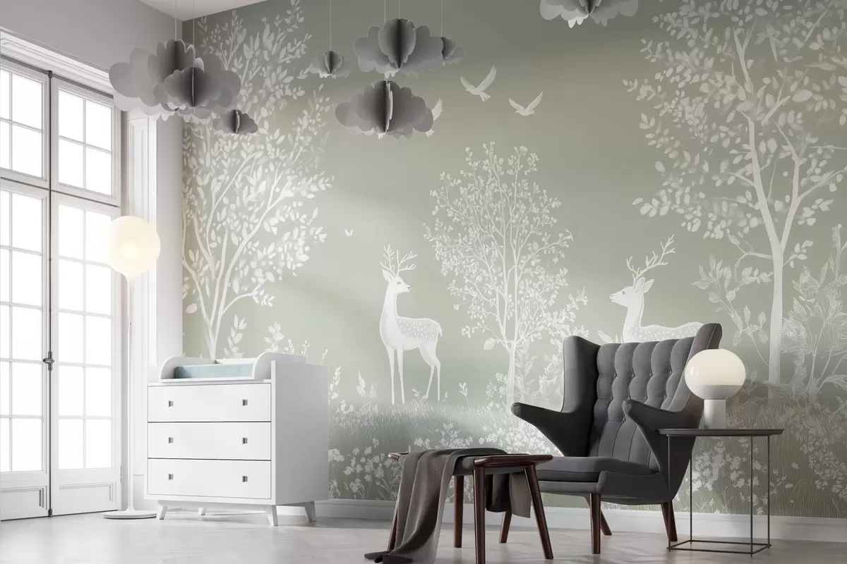 Stenske poslikave gozd z jeleni v slogu risbe s kredo na olivnem ozadju Št. w02444v1